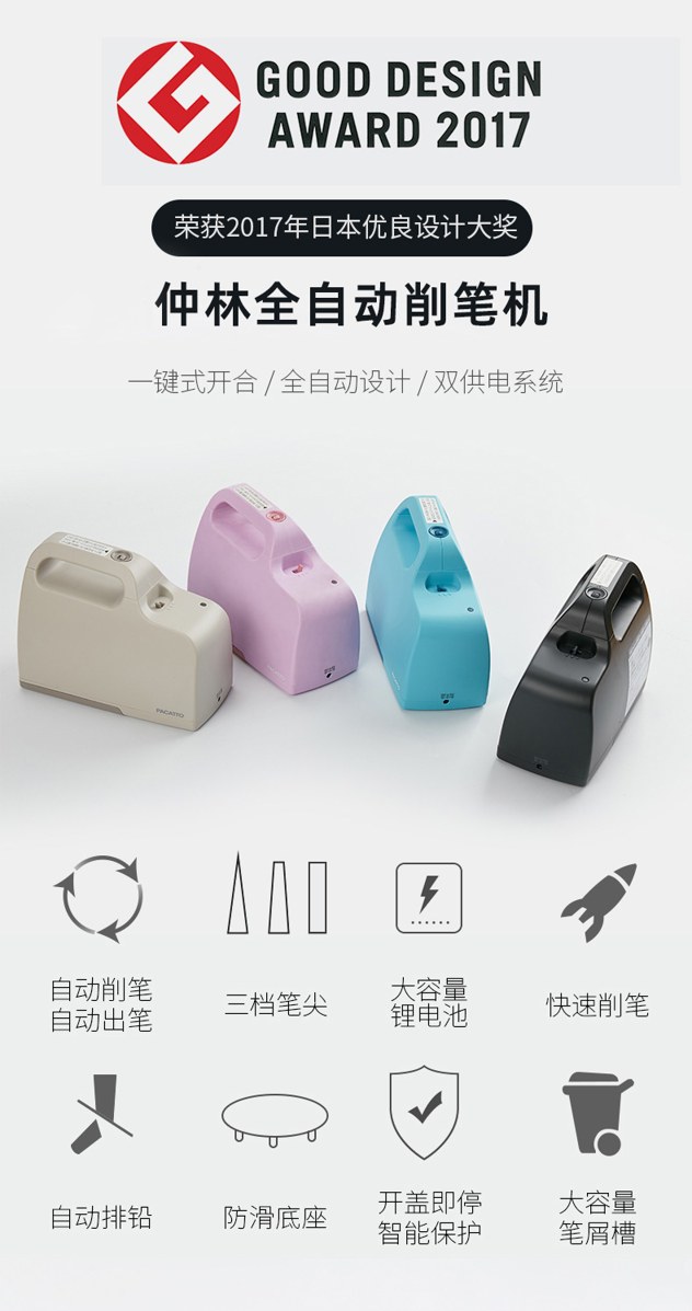 日本仲林电动削笔机,是很多赴日旅游的爸爸妈妈会买给小朋友的一件爆款文具,使用的时候,只需要把铅笔插入侧面的孔中,削笔机可以自动吸入、自动削笔以及自动弹出,使用起来非常的方便,刀片不外露,非常安全。超级方便的下开式笔屑清理,可自动排除断芯,在电动削笔刀中是非常棒的黑科技!