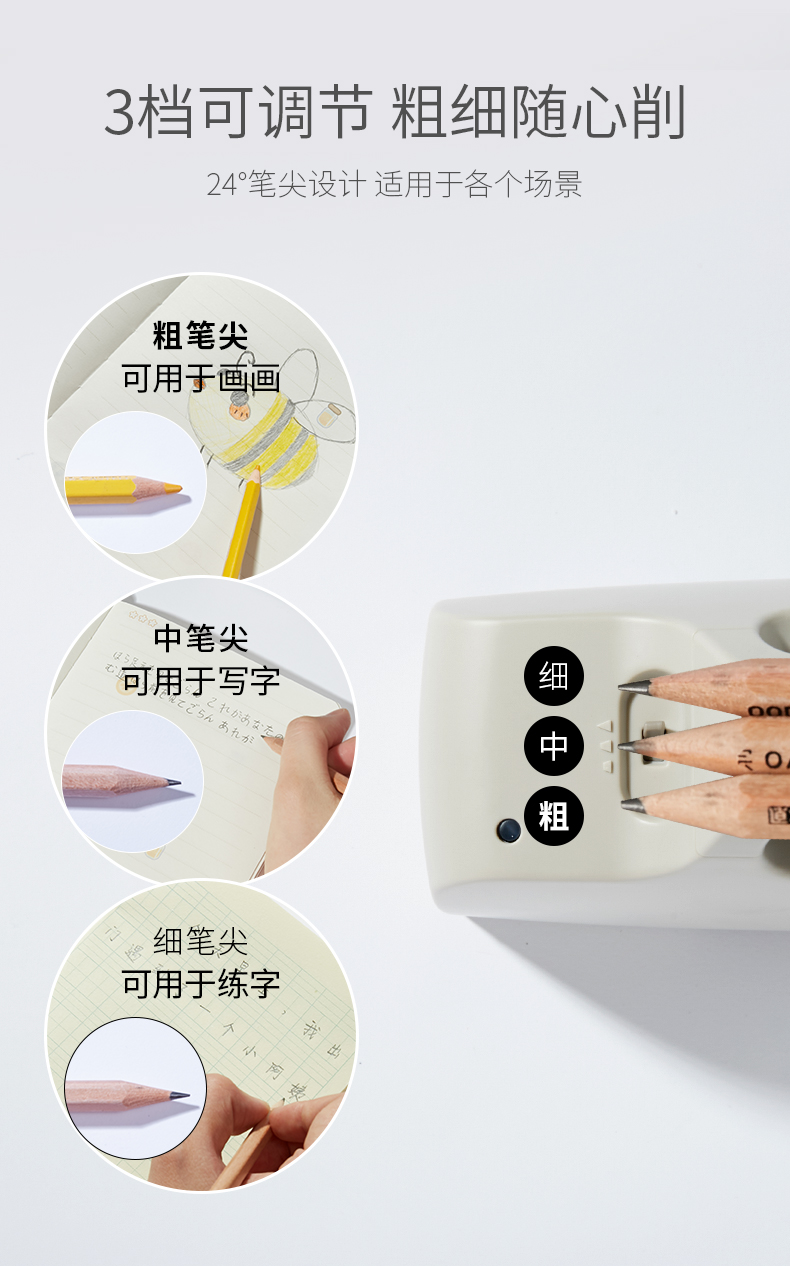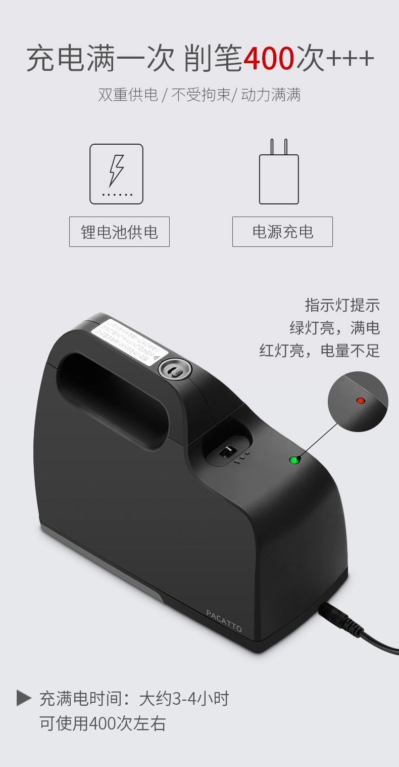 除此之外,这款削笔机能够削出三种不同的笔尖,露芯长度在5-7毫米之间,只需推动机身顶部的档位即可实现。搭载了1800毫安时的大容量电池,充满电后能够持续工作3-4个小时,以削一支铅笔半分钟为例,大概能够削400支铅笔,所以也不需要担心经常充电的尴尬。