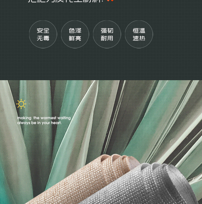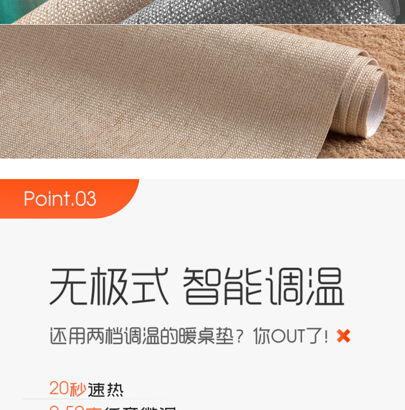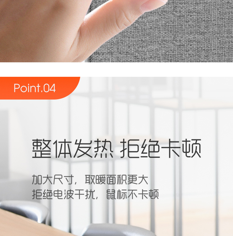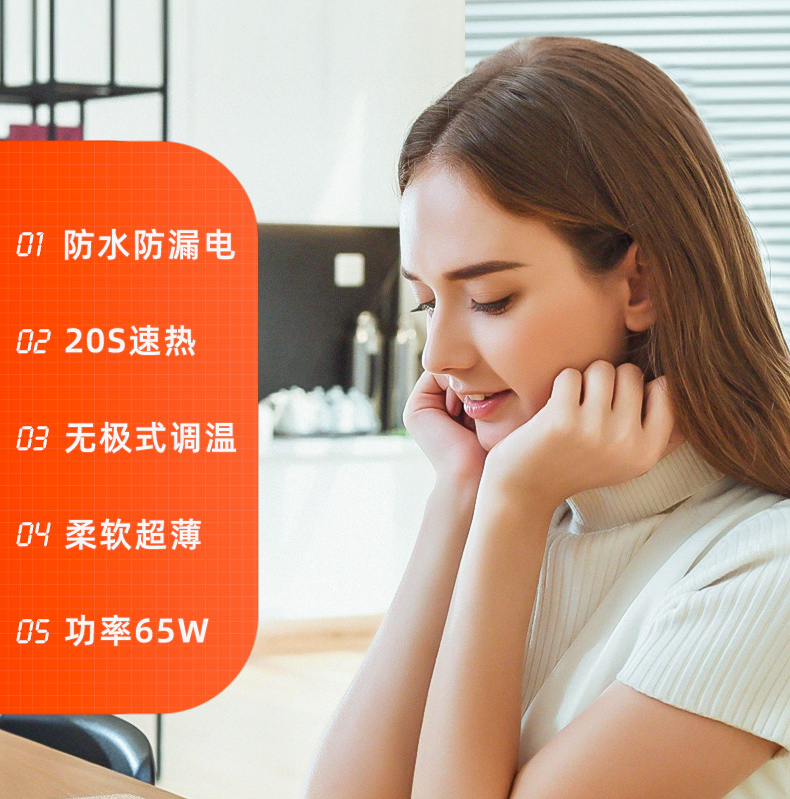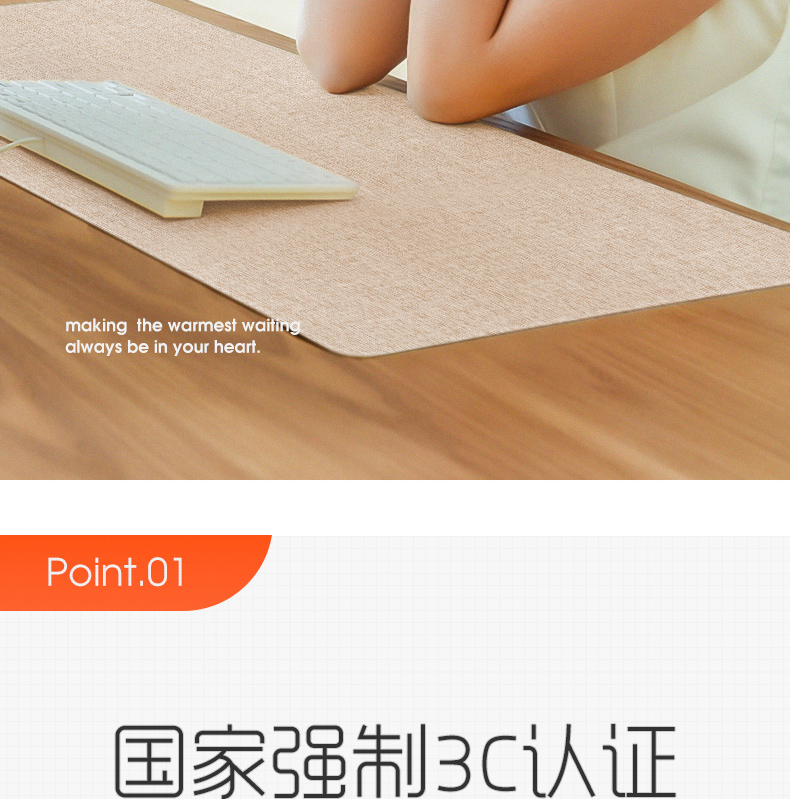 冬天温度低,长时间的办公难免会出现手凉的情况,既不舒服也会降低效率,这款加热桌垫就专为冬季手冷研发,内置优质发热丝,防水防漏电,无极调温设计,20秒速热,柔软超薄,使用方便,功率65W,使用安全又放心。