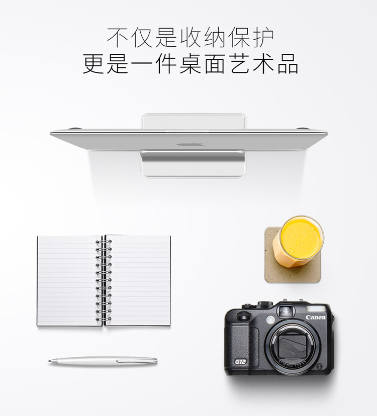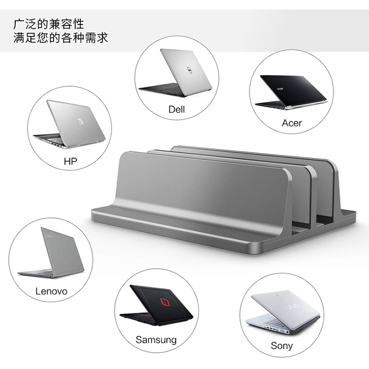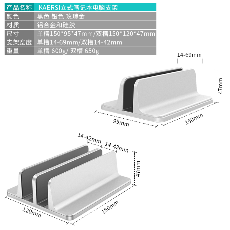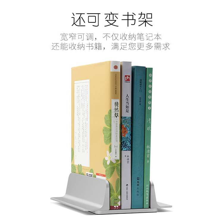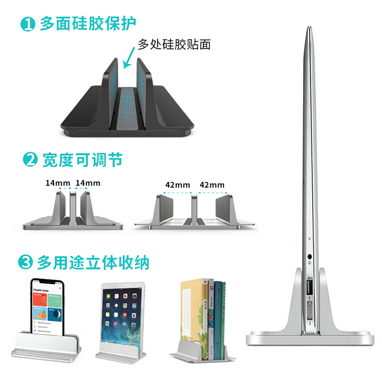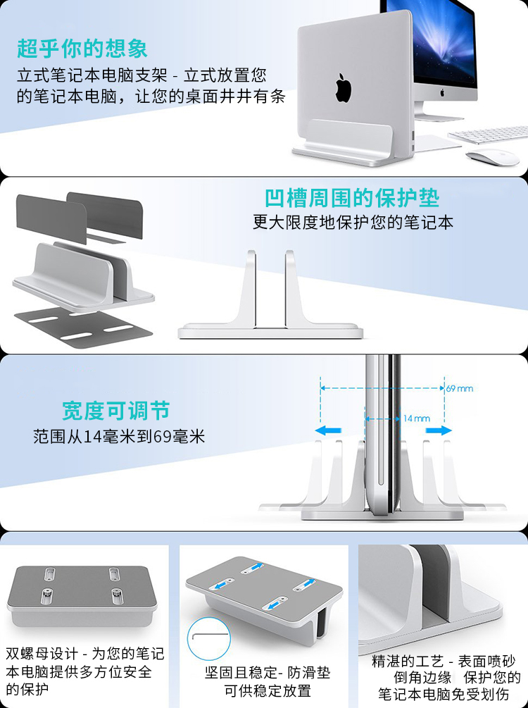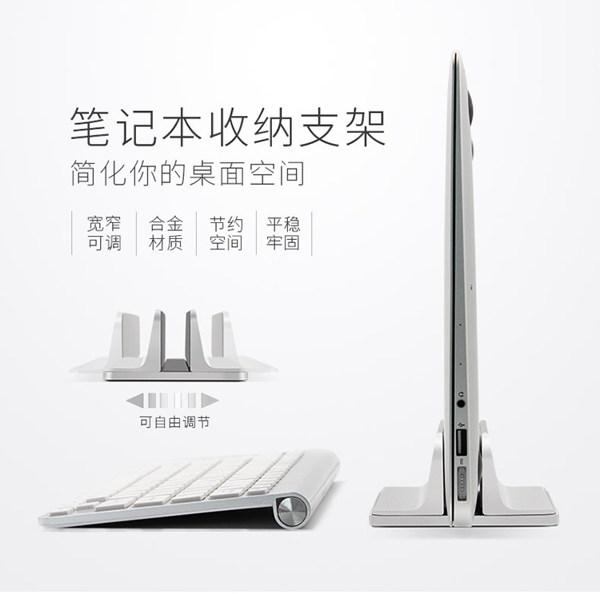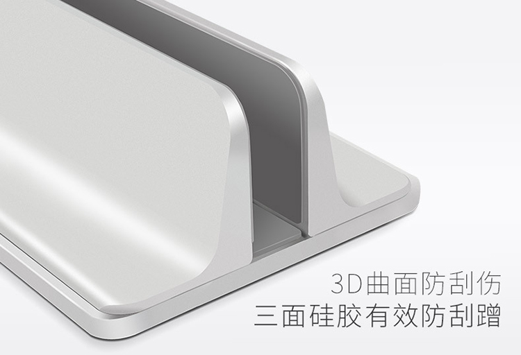 这款支架专为桌面笔记本收纳设计,铝合金主体,内里有3面硅胶,有效防止剐蹭,底部也有防滑硅胶,使用安全方便,底部有可调节螺丝,通过前后滑动即可调整宽窄,适用面广。