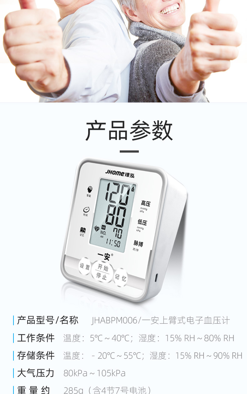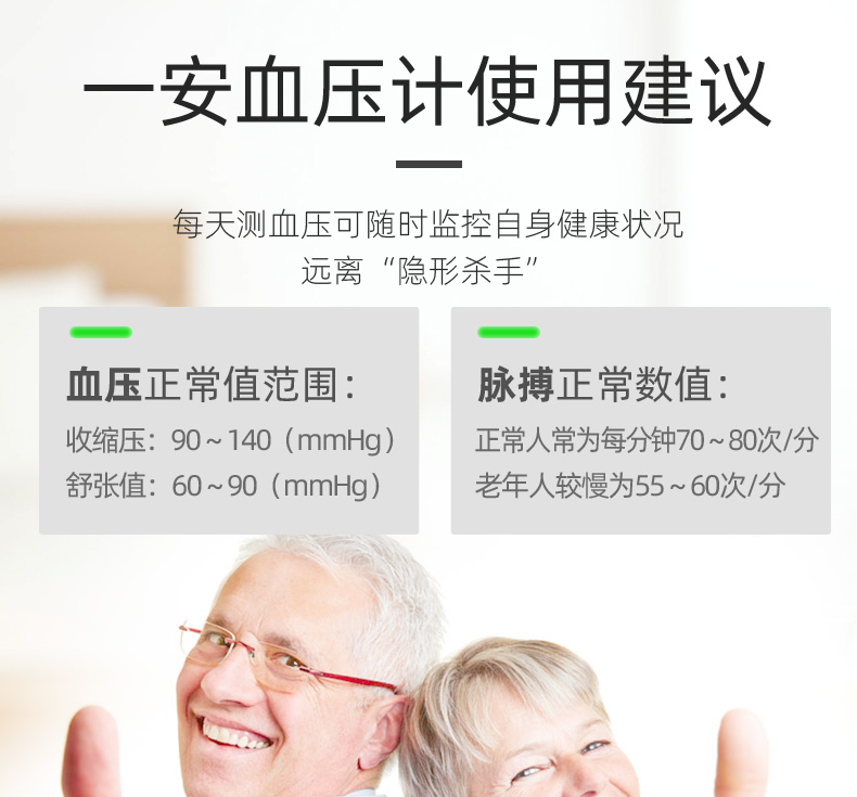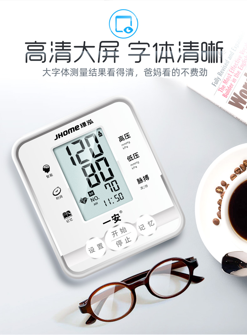 可同时支持2个用户使用,每个用户下课存储90组测量数据;一键测量,测血压/心率,一机双用;清晰大屏,数据显示清晰,大字屏显示,读取方便易懂,全程语音播报,读取清晰,音量大,适合老人使用。