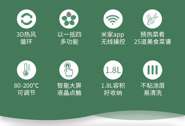 只能wifi款则支持米家app,在APP中可以查到很多常用的菜谱,根据菜谱准备食材就可以了,加入食材之后还可以直接选择开始,系统就会自己定好对应的时间和温度。全自动智能一键启动,80-200度广域控温,1.8升黄金容量,适合2-3人使用,多功能无油速炸,少卡路里更加健康。