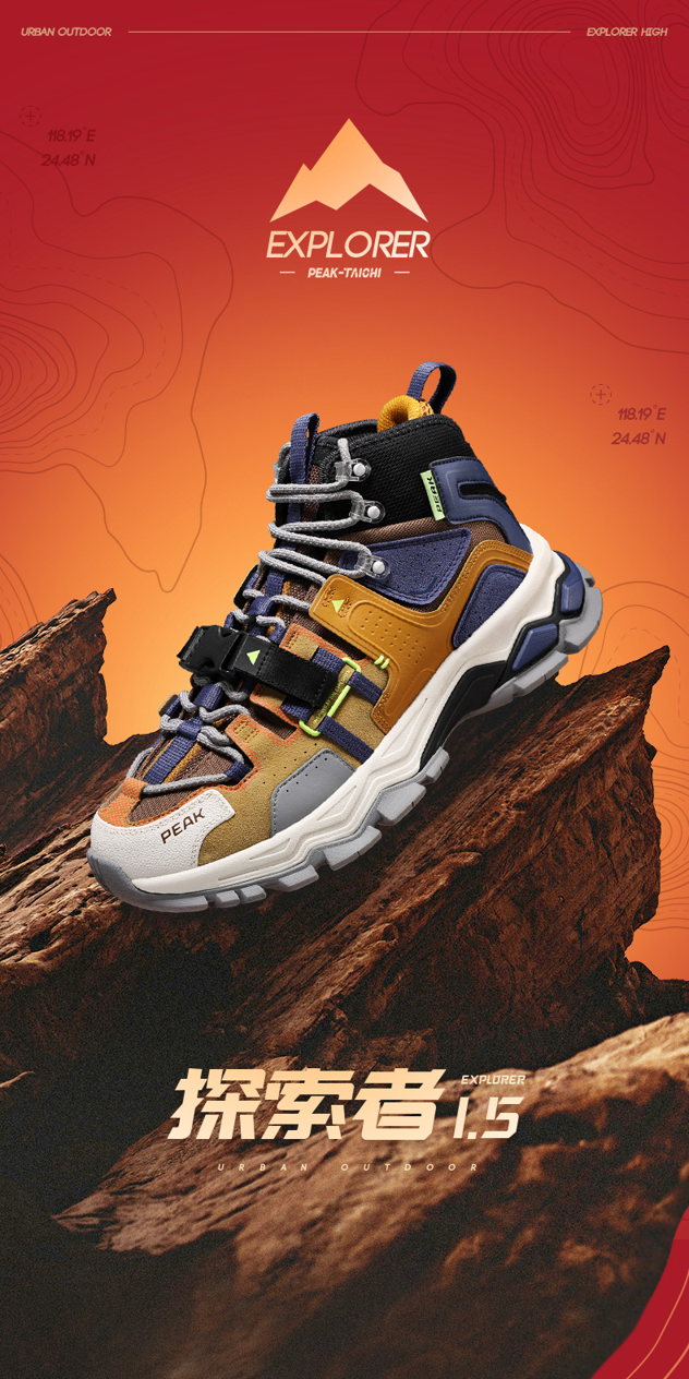 匹克态极旗下的又一款户外运动鞋,运用了当下时兴的解构式设计,满满的机能风格,鞋面由翻毛皮和科技布拼接,单只鞋72个零件,后跟皮料与立体材质组合,“EXPLORER”字样,彰显探索者的身份,复杂的细节带来机能户外风格。
