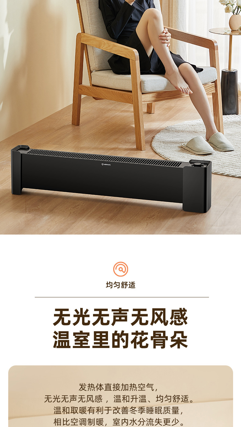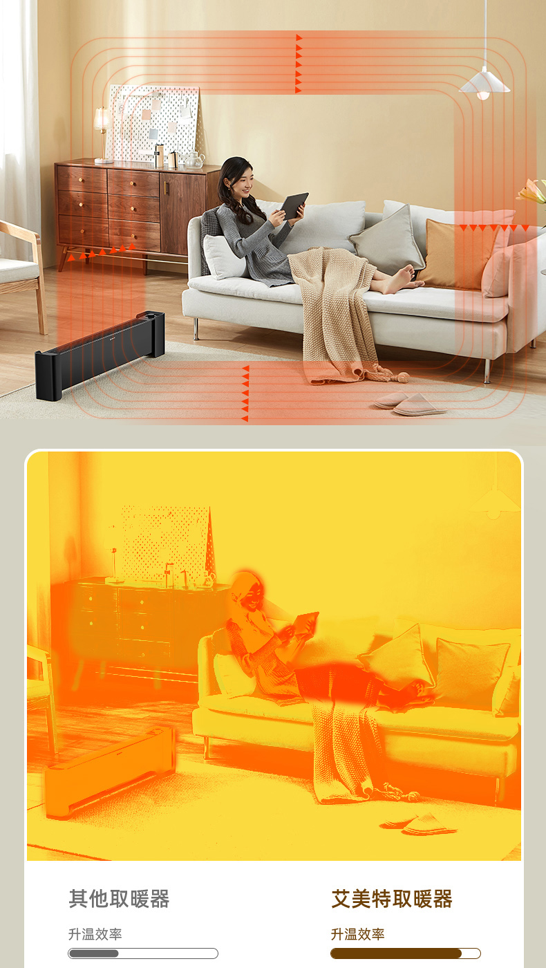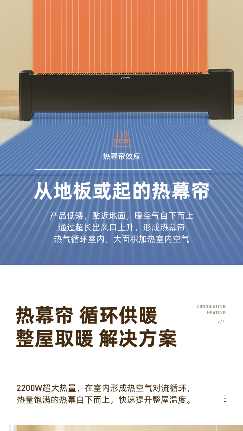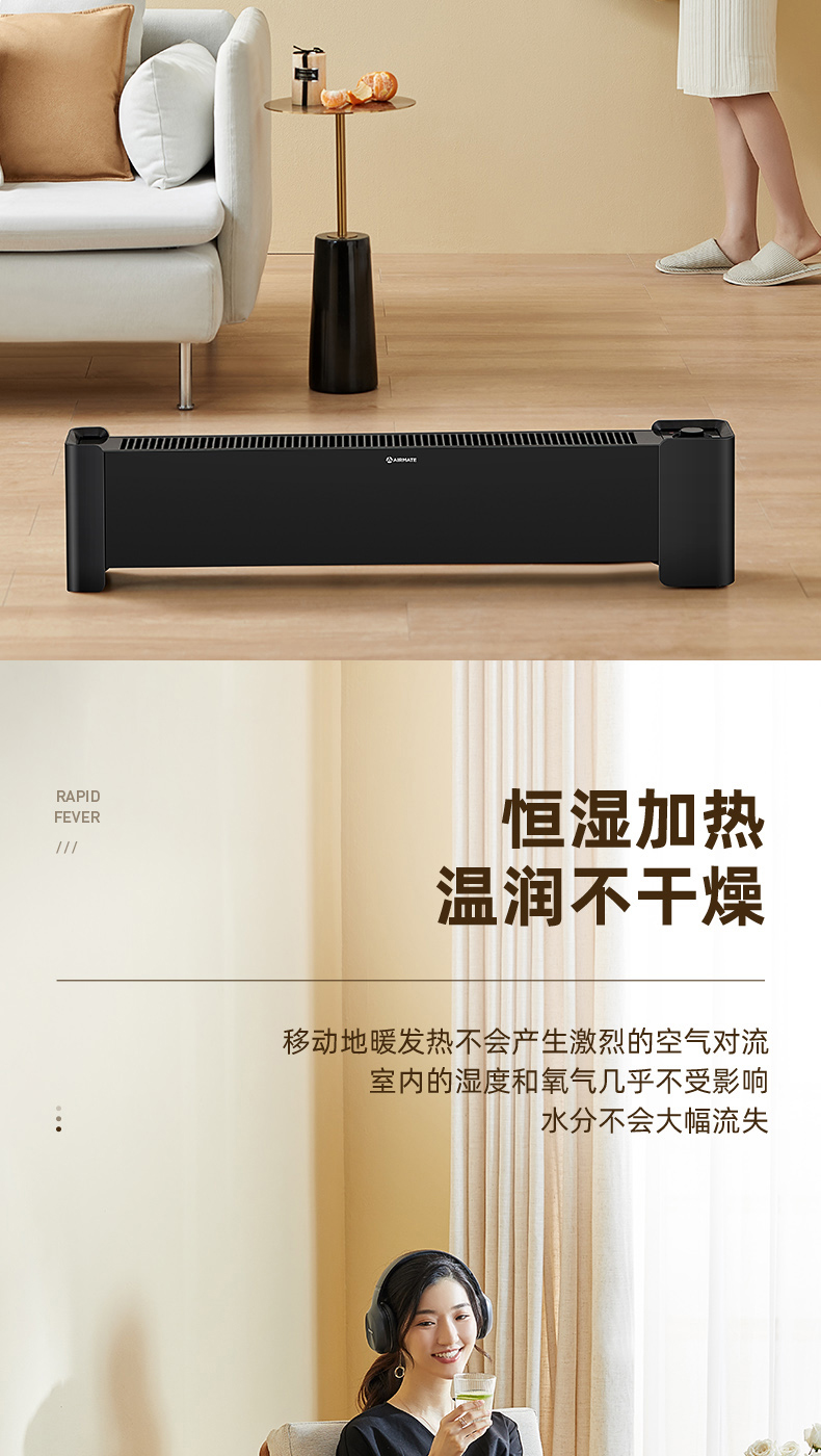 艾美特出品的移动式地暖,从下往上热气流立体循环,2200w超大热量,整屋升温。新型合金发热体,无光无声无风感,升温不干燥,113片大热量,3s速热 。具备安全童锁、倾倒自动断电、过热保护等安全防护。