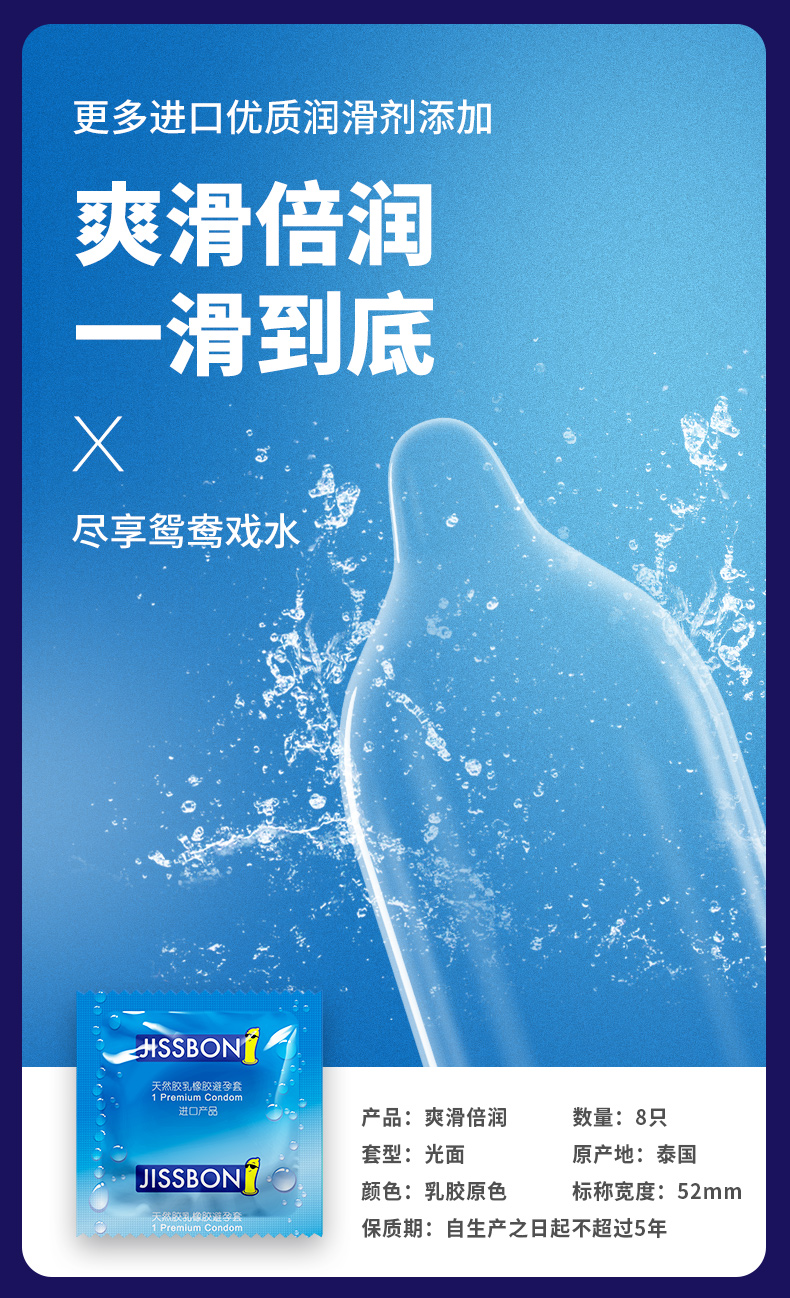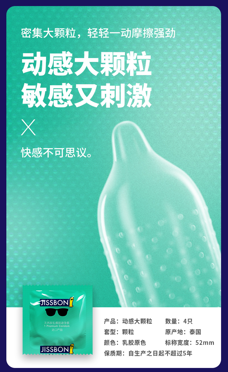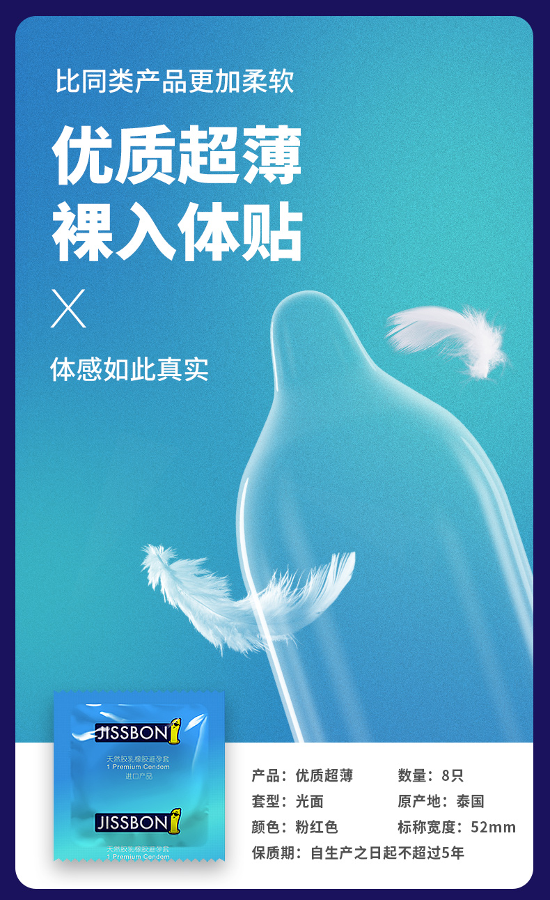 5种款式5种不同体验 包含:优质超薄8只、爽滑倍润8只、轻盈薄8只、动感螺纹4只、动感大颗粒4只。采用优质乳胶,更柔韧舒适,添加足量润滑剂,易清洗不黏腻,畅顺丝滑,依据男性人体生理结构设计,紧密贴合不松垮。