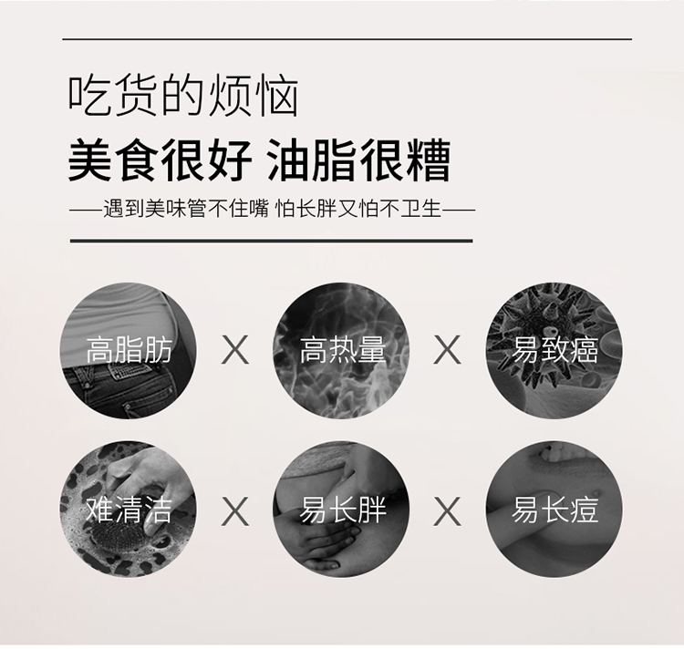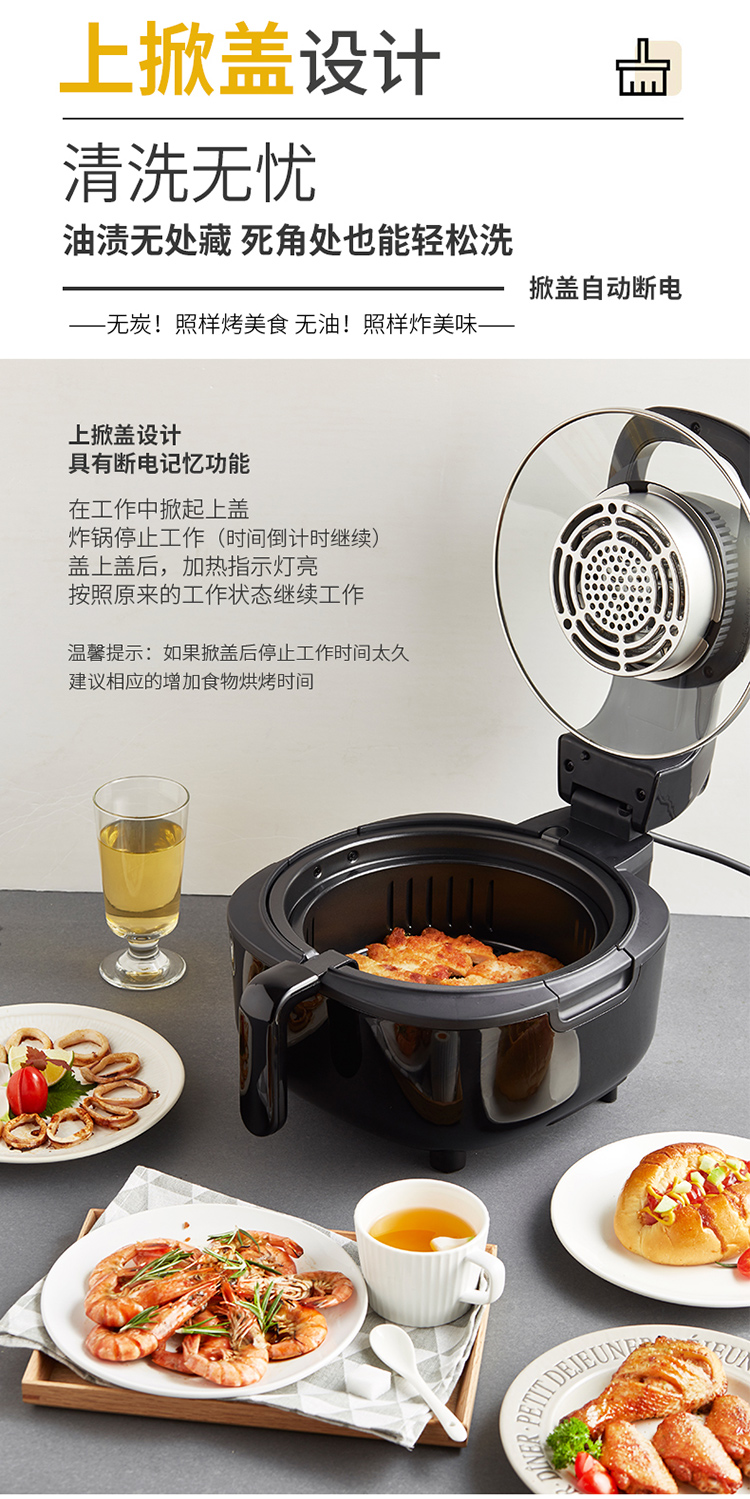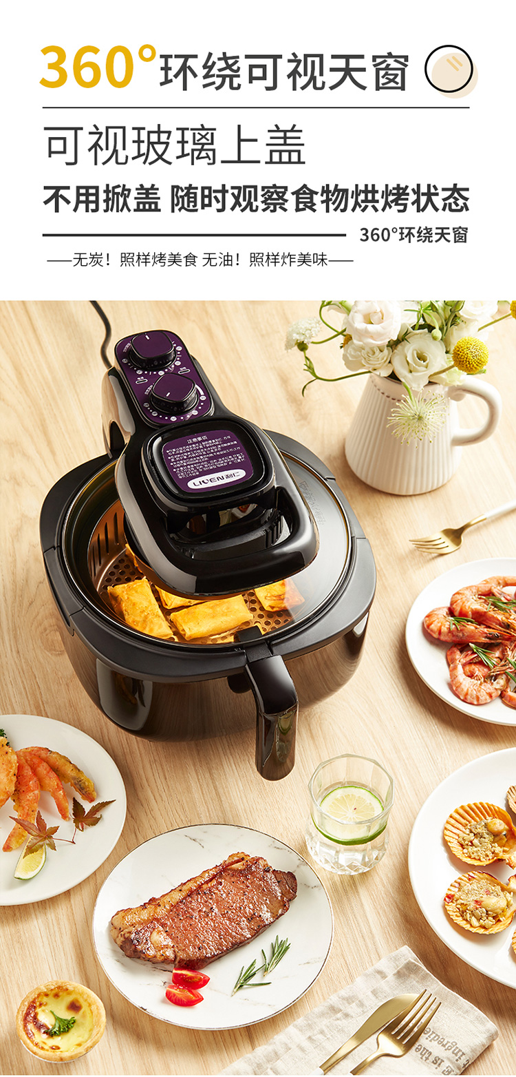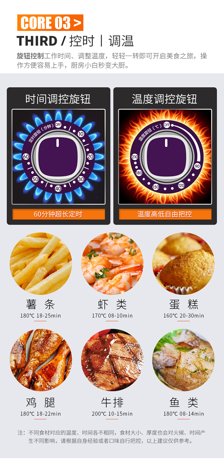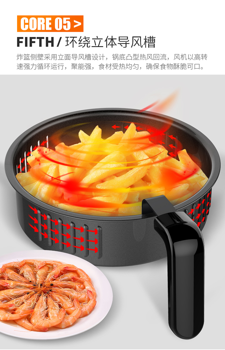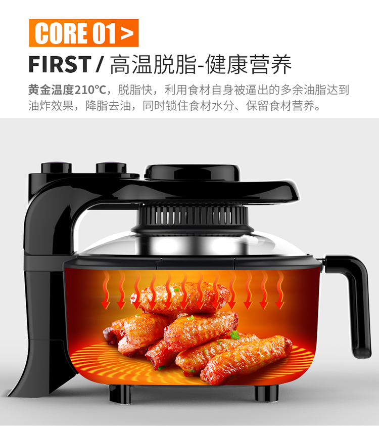 210℃的黄金温度,即可快速高温脱脂,同时也能锁住食材水分和营,超过210℃,容易破坏食物营养,低于210℃,食物无法烤熟;空气炸锅主要是利用食材自身被逼出的多余油脂,通过热风360°全面循环煎炸,达到油炸效果,有效降脂去油;