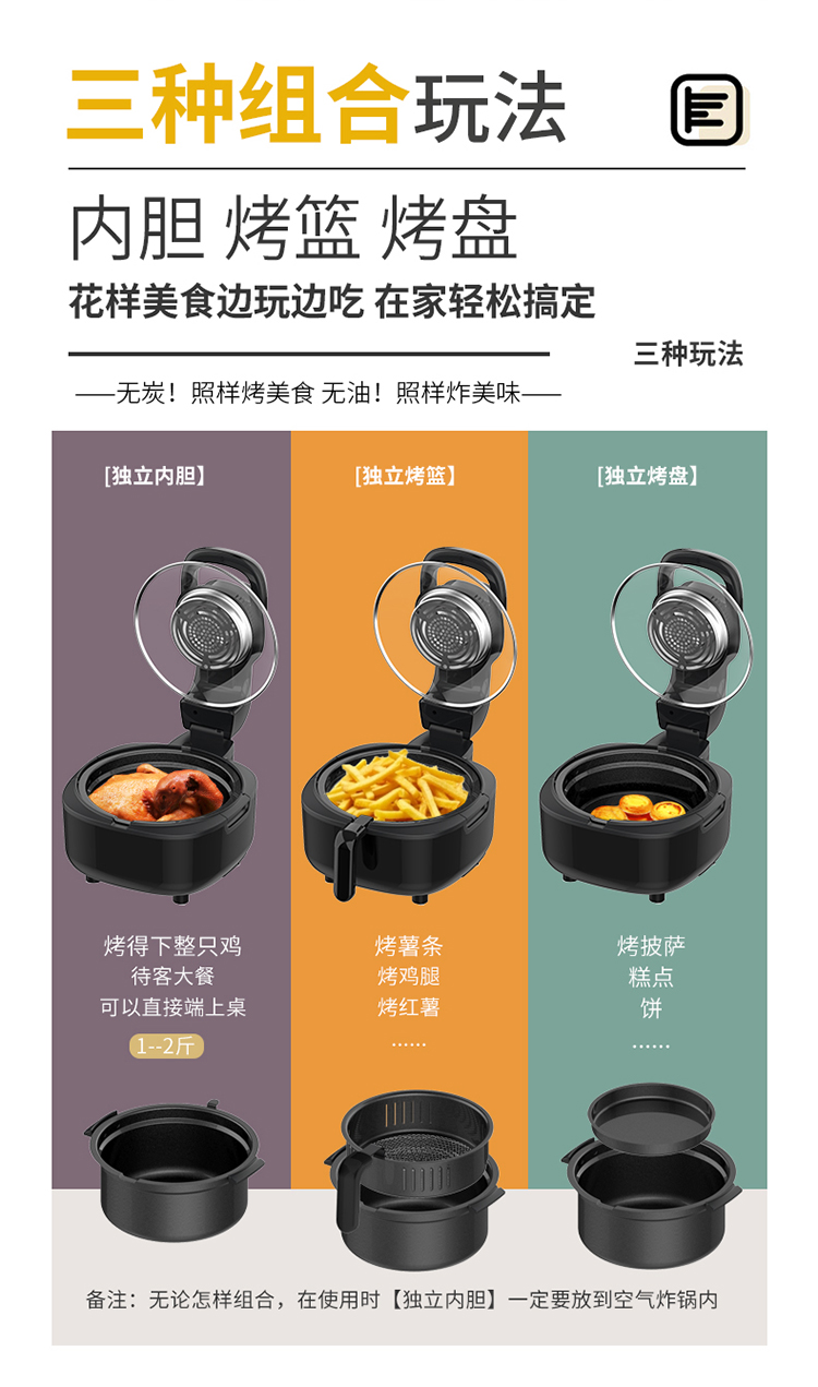 空气炸锅其原理和烤箱类似,通过高速热空气循环,利用食物自身的油脂炸熟食材,相对比传统的油炸更健康,口味也和烧烤的差不多,味道不错。相比烤箱的大体积,空气炸锅更省空间,适合三口之家日常使用,比较实用。