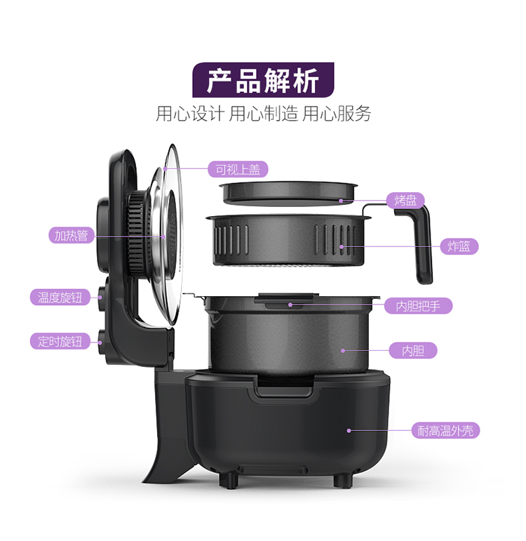 炸篮侧壁采用立面环绕导风槽,锅底凸型回流全面,风机以高转速强力循环运行,聚能强,食材均衡受热,不烧焦夹生,确保酥脆可口;旋钮操控,随心控制温和定时,可控温度范围是90℃-210℃,透明钢化锅盖,可观看烹饪过程,尺寸为280*380*250mm。