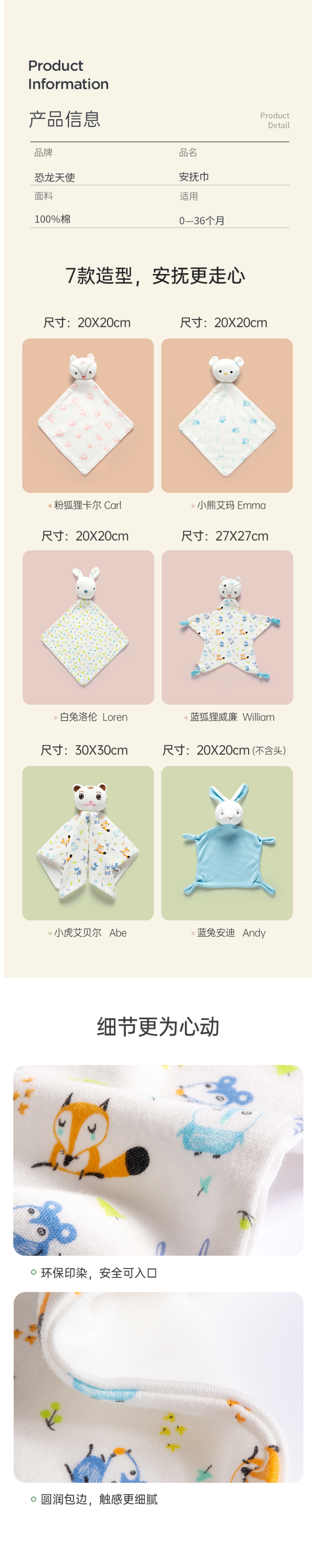 恐龙天使是罗莱生活旗下的母婴品牌,这款婴儿安抚巾,符合母婴级的A类标准(本 站),无甲醛、荧光增白剂、致癌芳香胺,非常安全,适合婴儿使用。