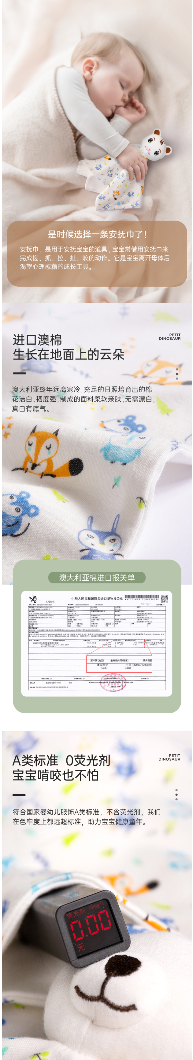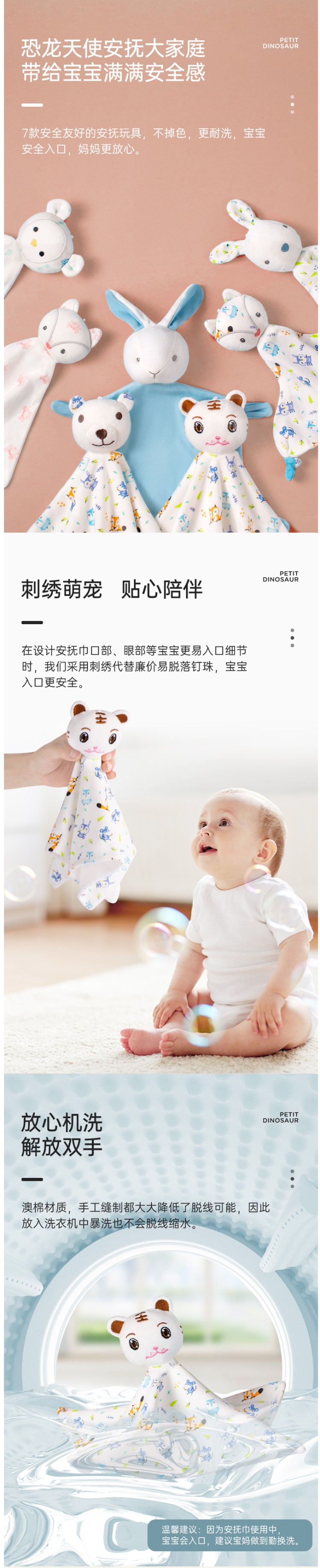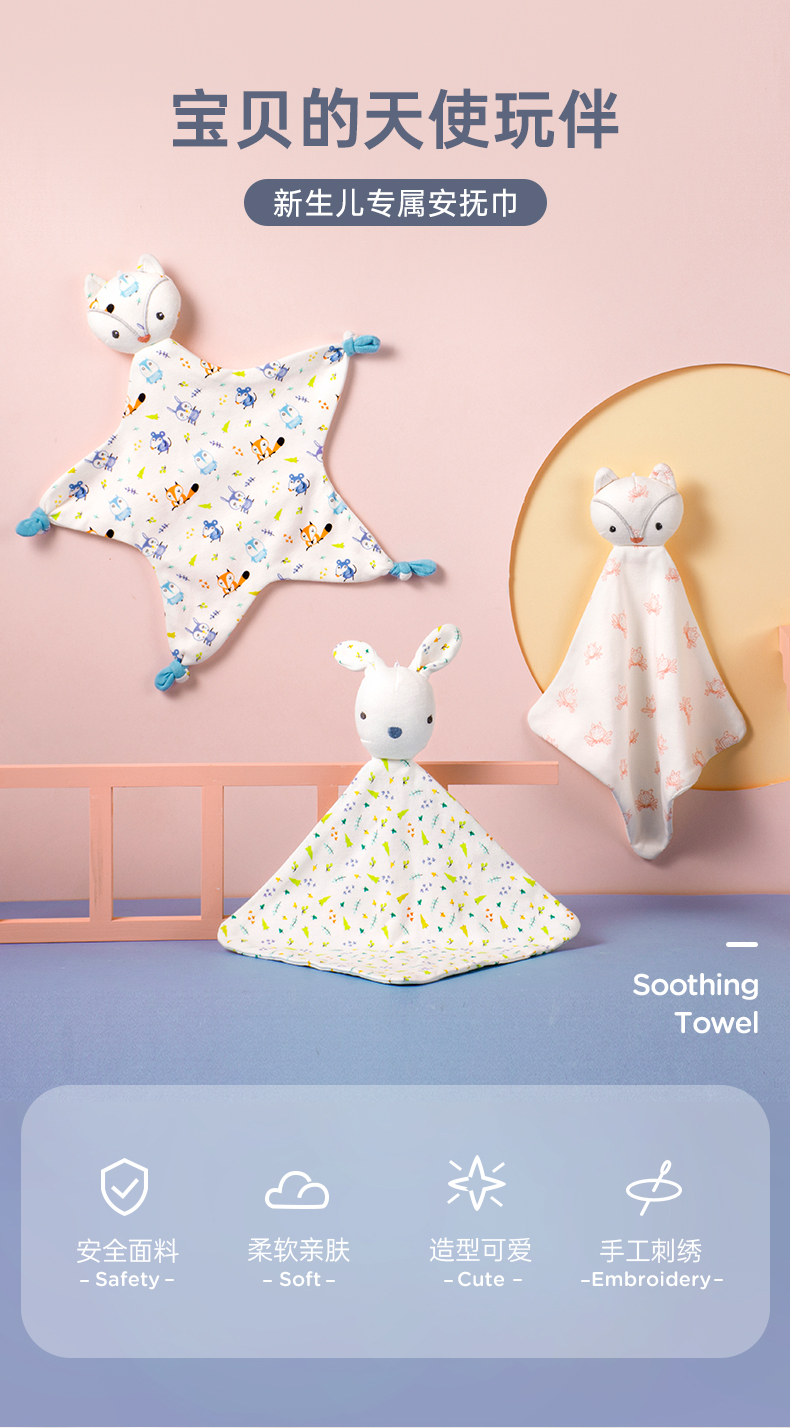 采用100%进口环保有机澳棉,近乎无菌品质,亲肤无刺激,不掉色、更耐洗。在安抚巾动物造型的口部、眼部等宝宝更易入口的部位,使用刺绣代替廉价易脱落钉珠,防止宝宝入口导致危险。