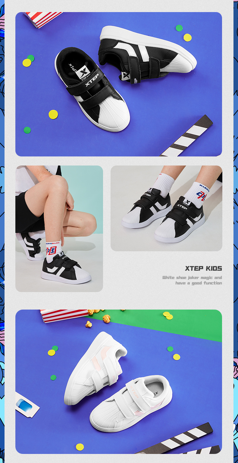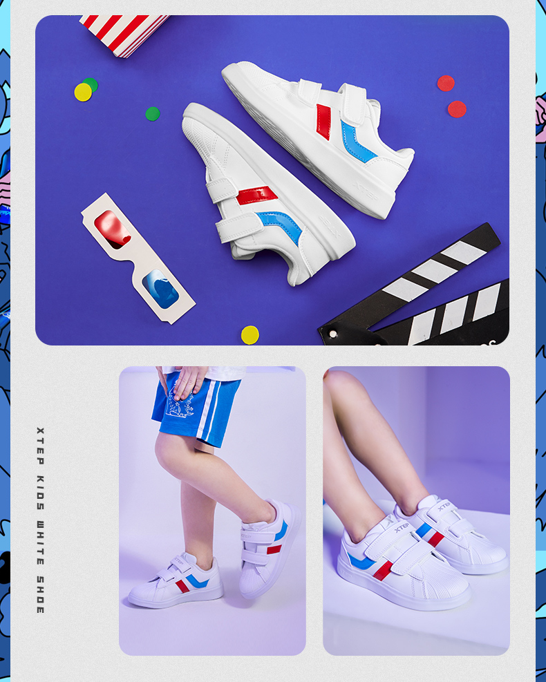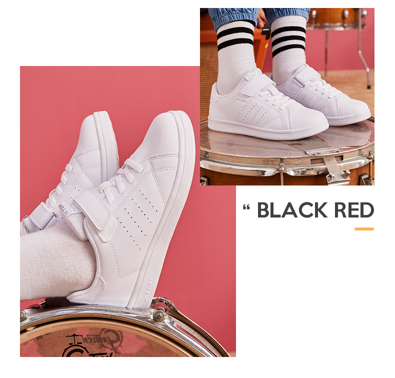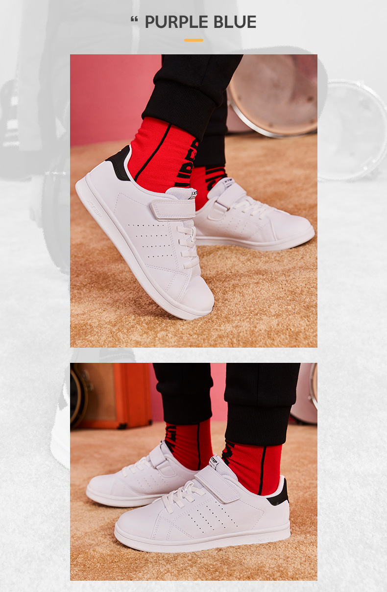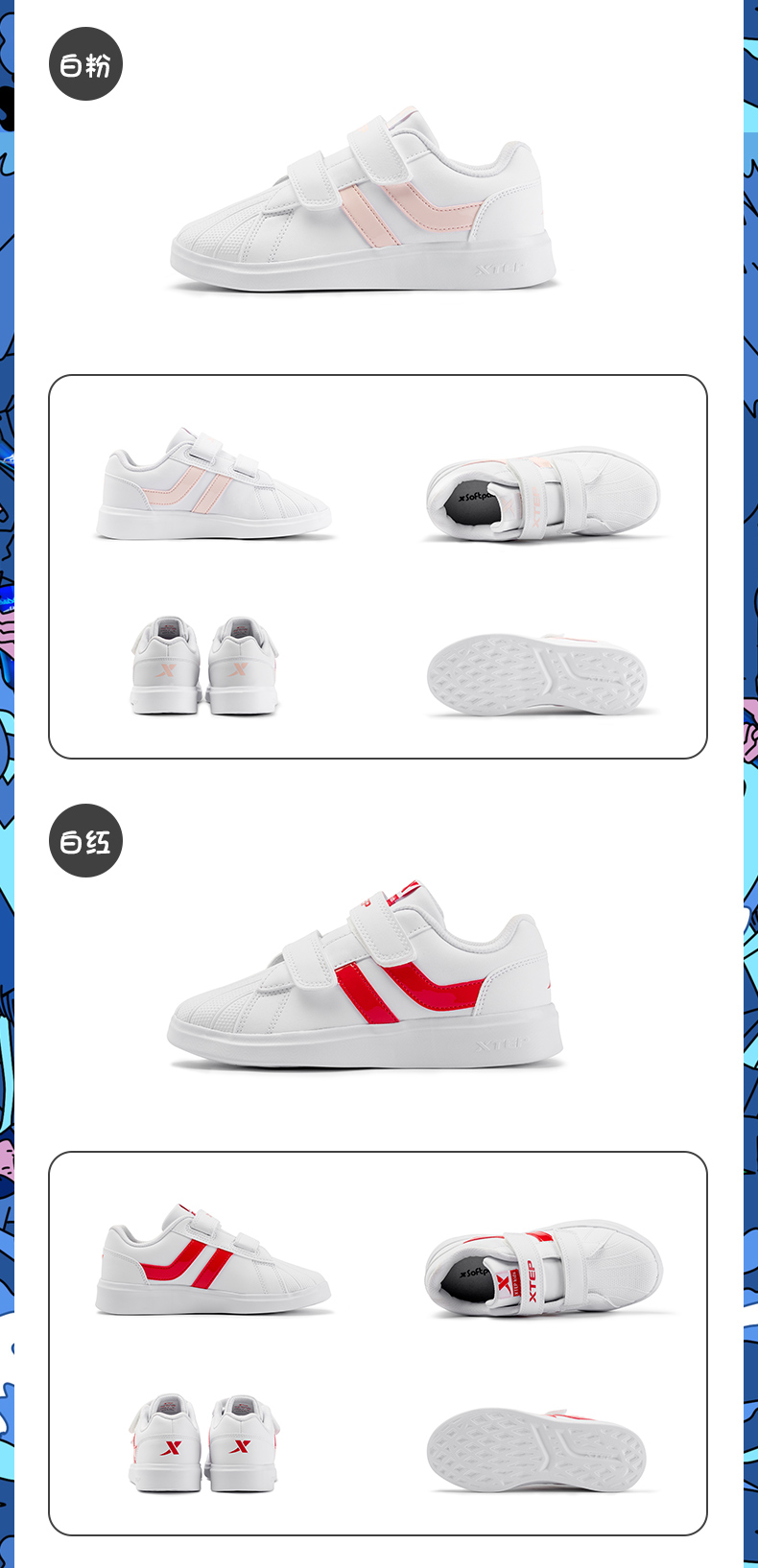 这款特步儿童休闲板鞋是2020年秋季新款,经典小白鞋造型,在款式上类似阿迪的Stan Smith,贝壳头+尾标的组合,很帅气有没有。