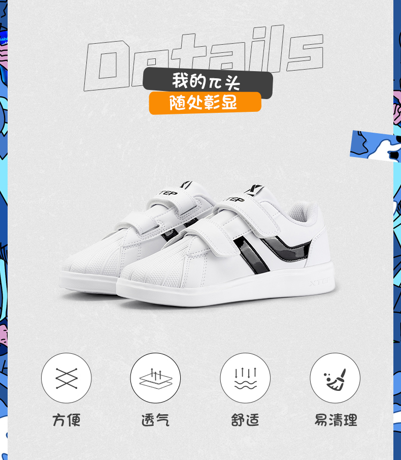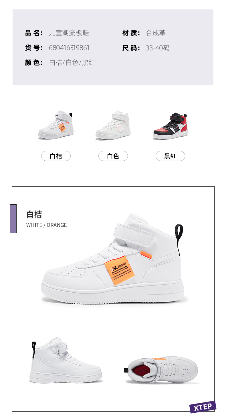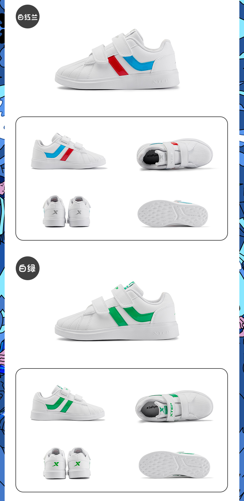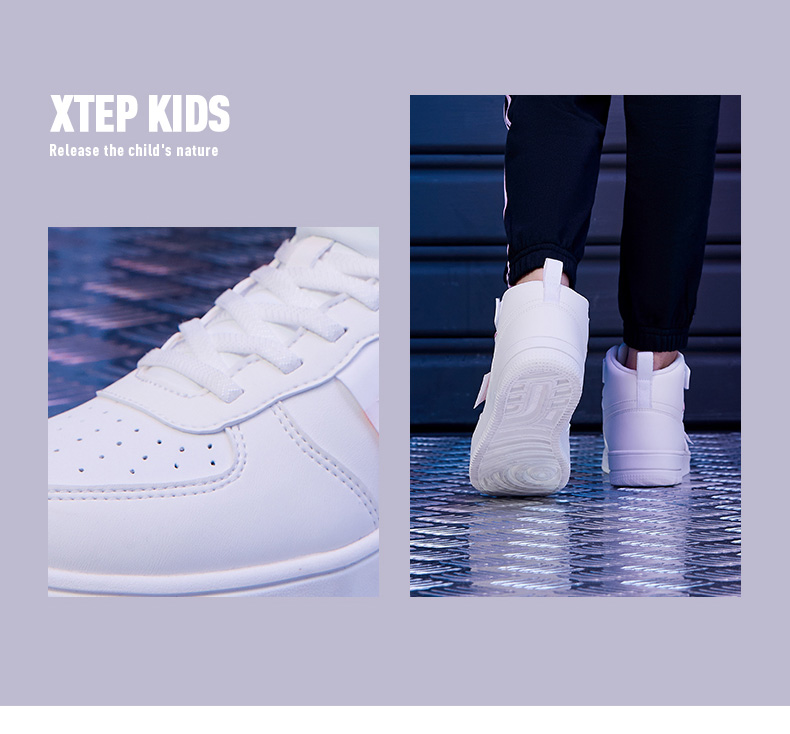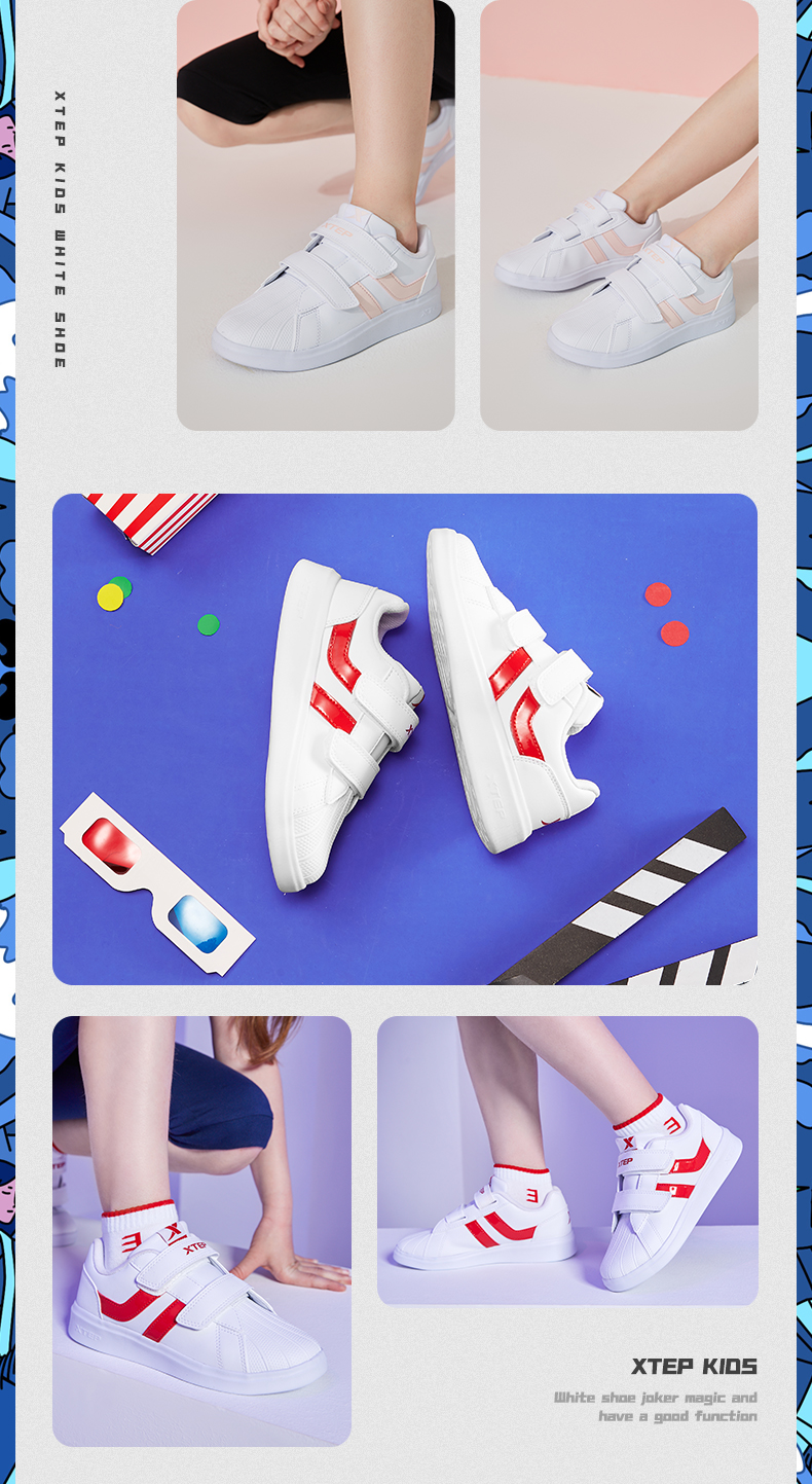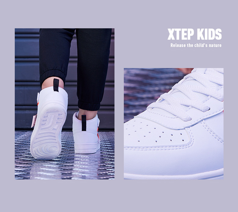 这款特步儿童休闲板鞋是2020年秋季新款,经典小白鞋造型,在款式上类似阿迪的Stan Smith,贝壳头+尾标的组合,很帅气有没有。