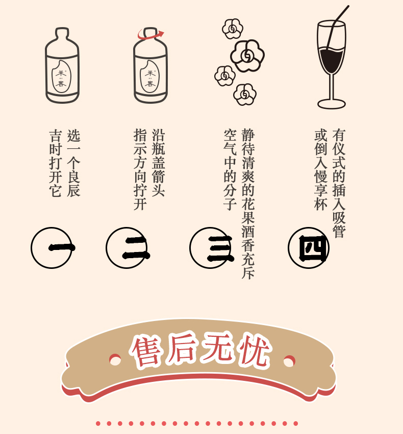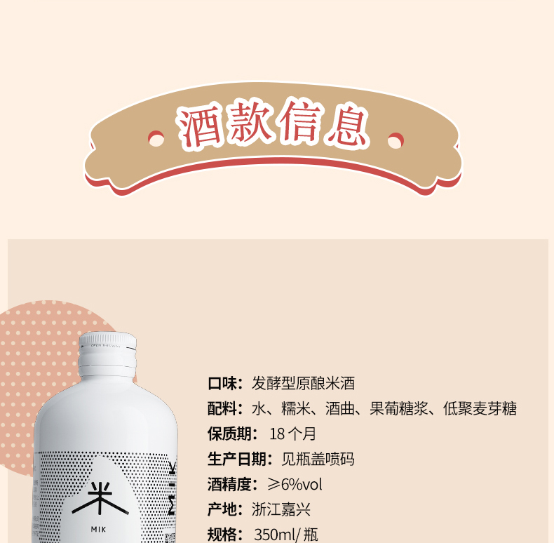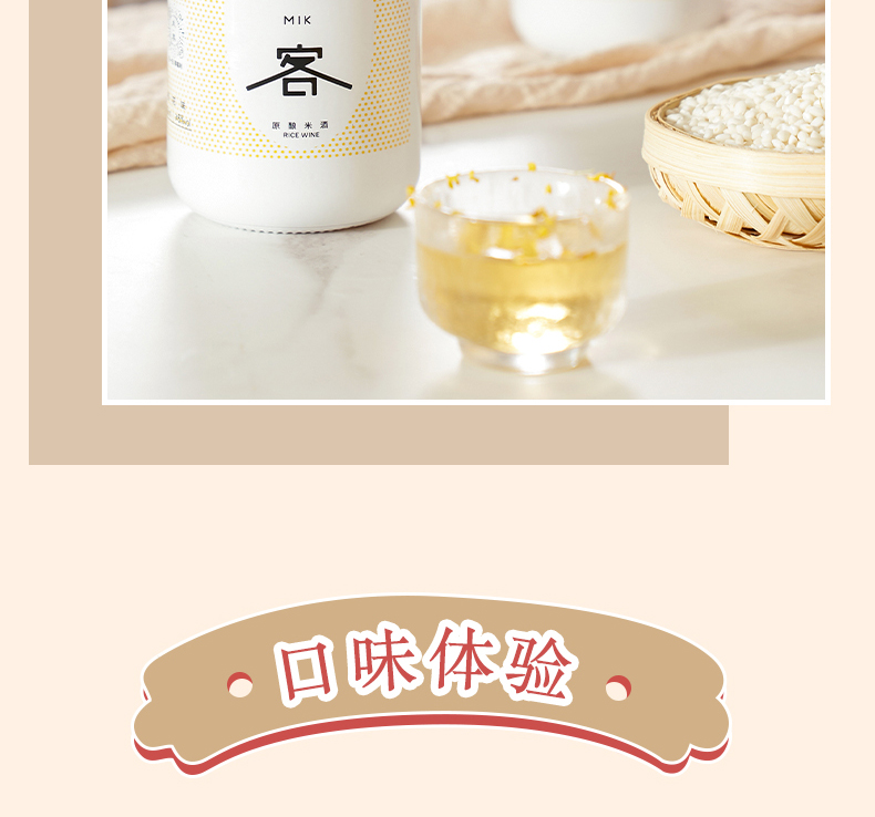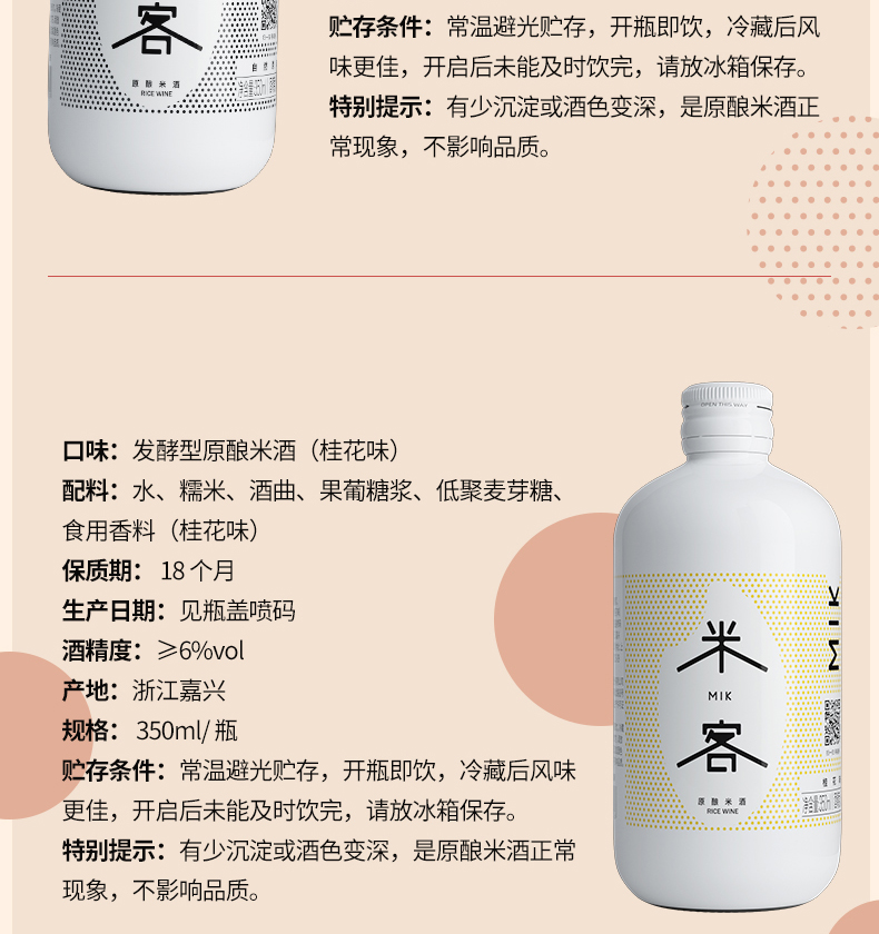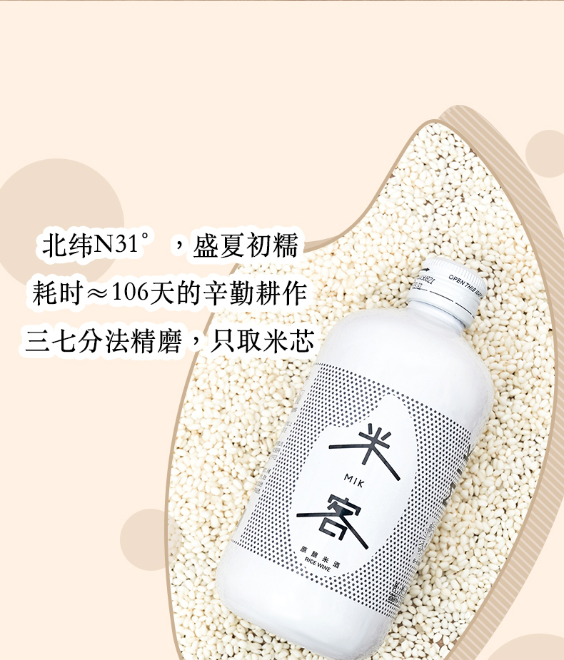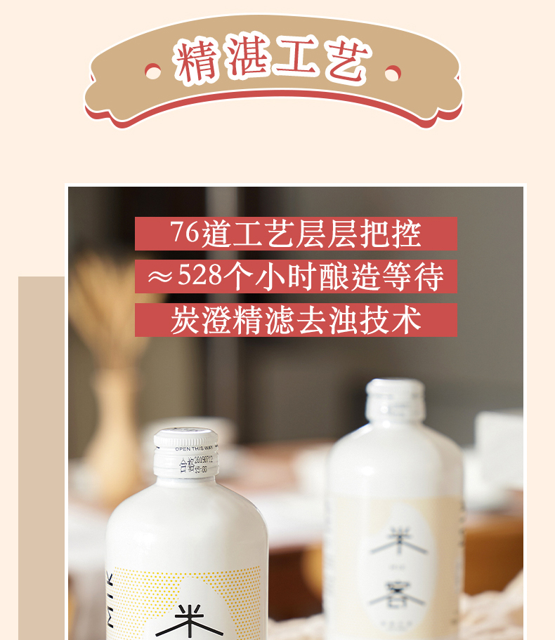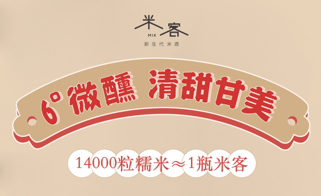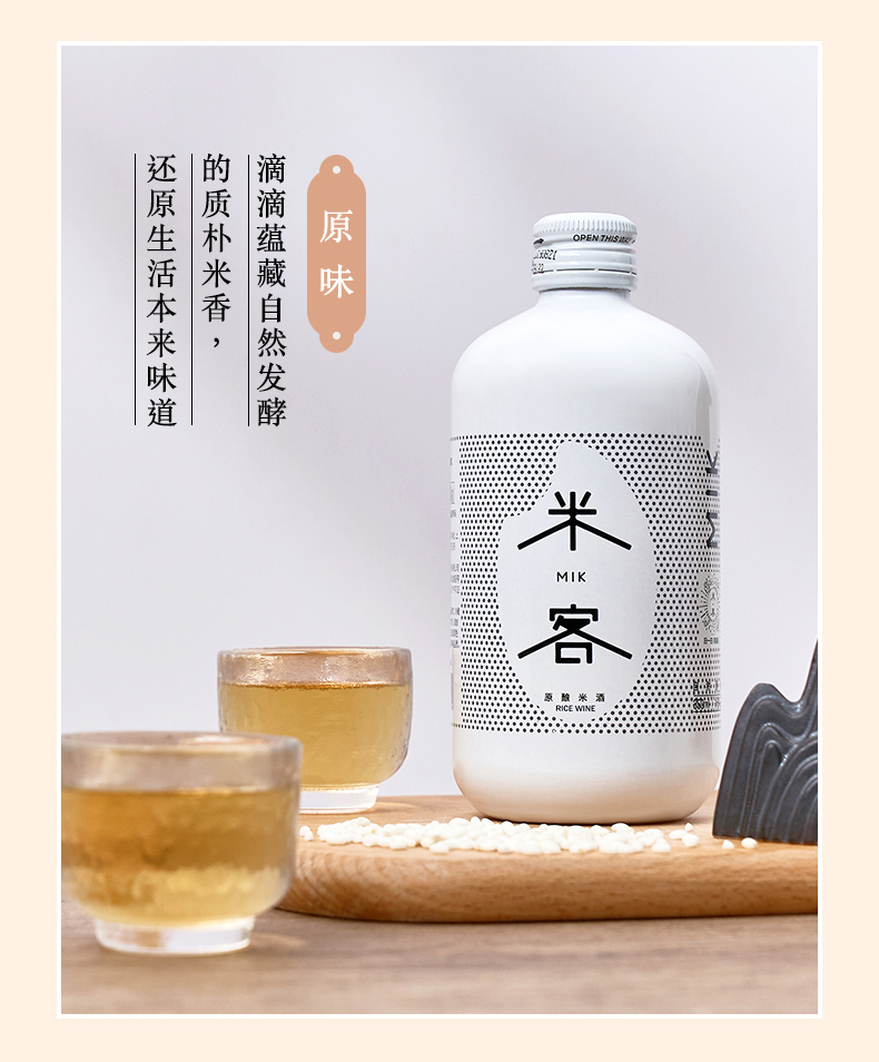 米客通过一年多的时间,结合中国传统酿造技艺和日本清酒后道科技技术,对传统中国米酒进行了大胆工艺革新,开创了全发酵清酿米酒工艺,这使得米客在整个酒体上远远超越了传统米酒,无论是在酒的口感、就得色泽还是酒的包装上都进行了全面的突破。