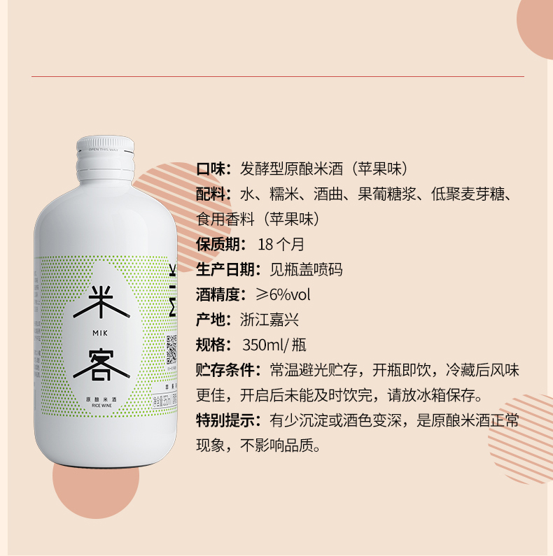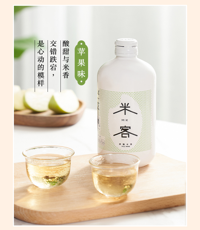这款米客低度米酒,糯米口味自然,苹果清新,桂花淡雅,度数只有6度,适合盆朋友聚餐饮用,不易醉,女性也可放心饮用。