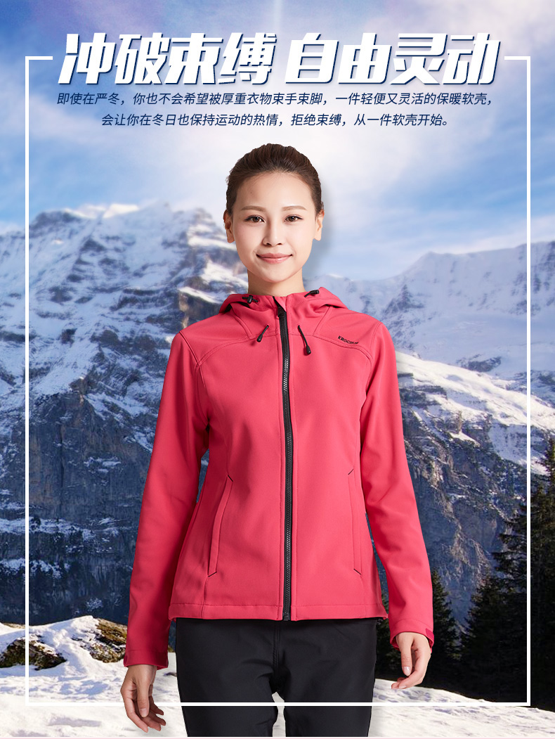 地球科学家这款女软壳夹克,特点是高弹力、保暖和防风拒水。采用的是四面弹力复合面料,单层双面设计,外层是梭织的软壳面料,可达97%防风,里面是保暖的抓绒,自带四向弹力,比运动服还活动自如,抗皱好打理。