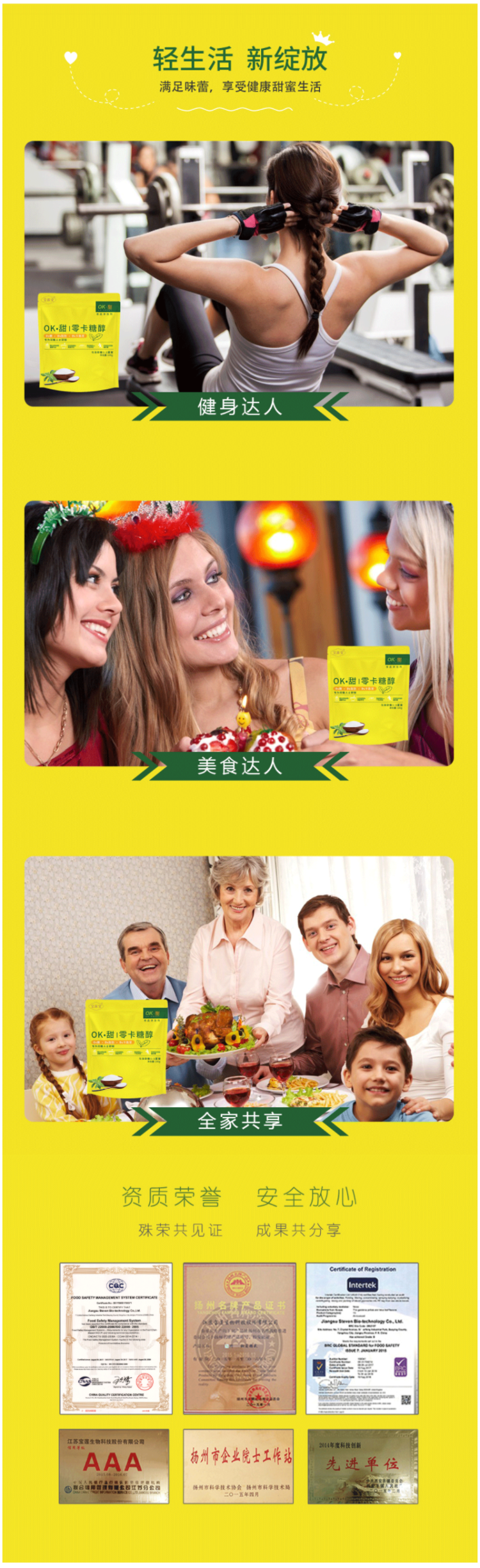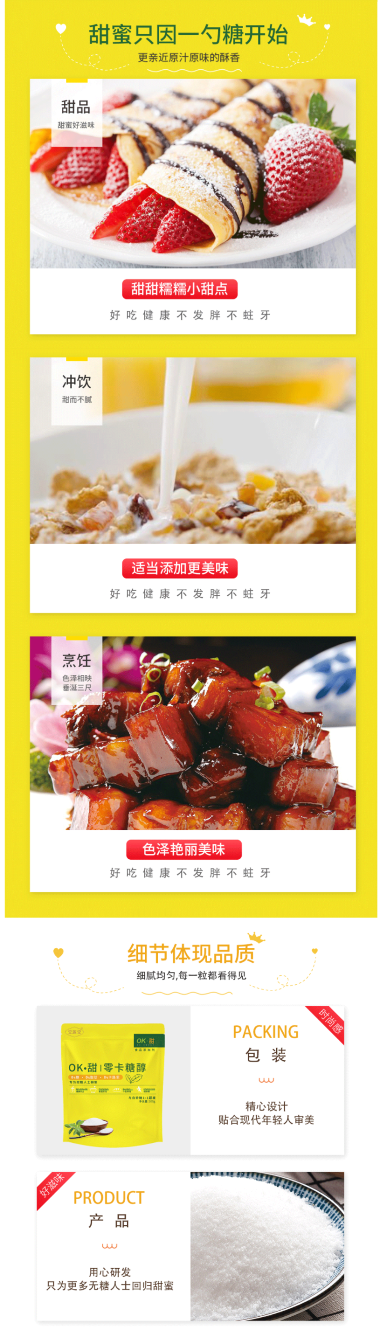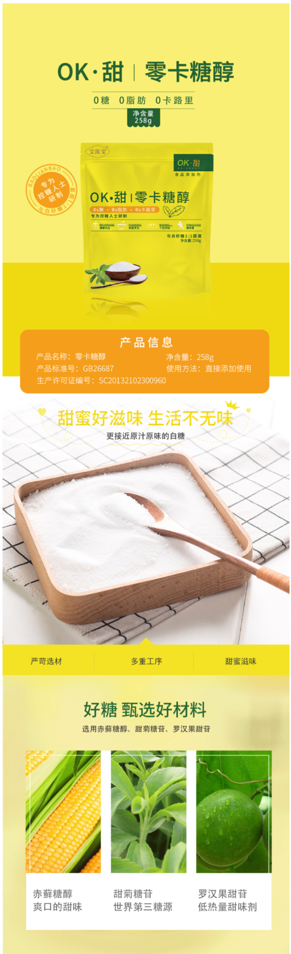 这款宝莲宝OK·甜 零卡糖醇,选用赤藓糖醇、甜菊糖苷、罗汉果甜苷制成,相比于家用白糖不含有糖糖分、脂肪、卡路里,不会引起血糖波动,不会发胖,是一种天然健康的甜味剂,是糖尿病人的理想之选,也可作为烘焙的甜味剂,再怎么吃也不用担心会蛀牙。