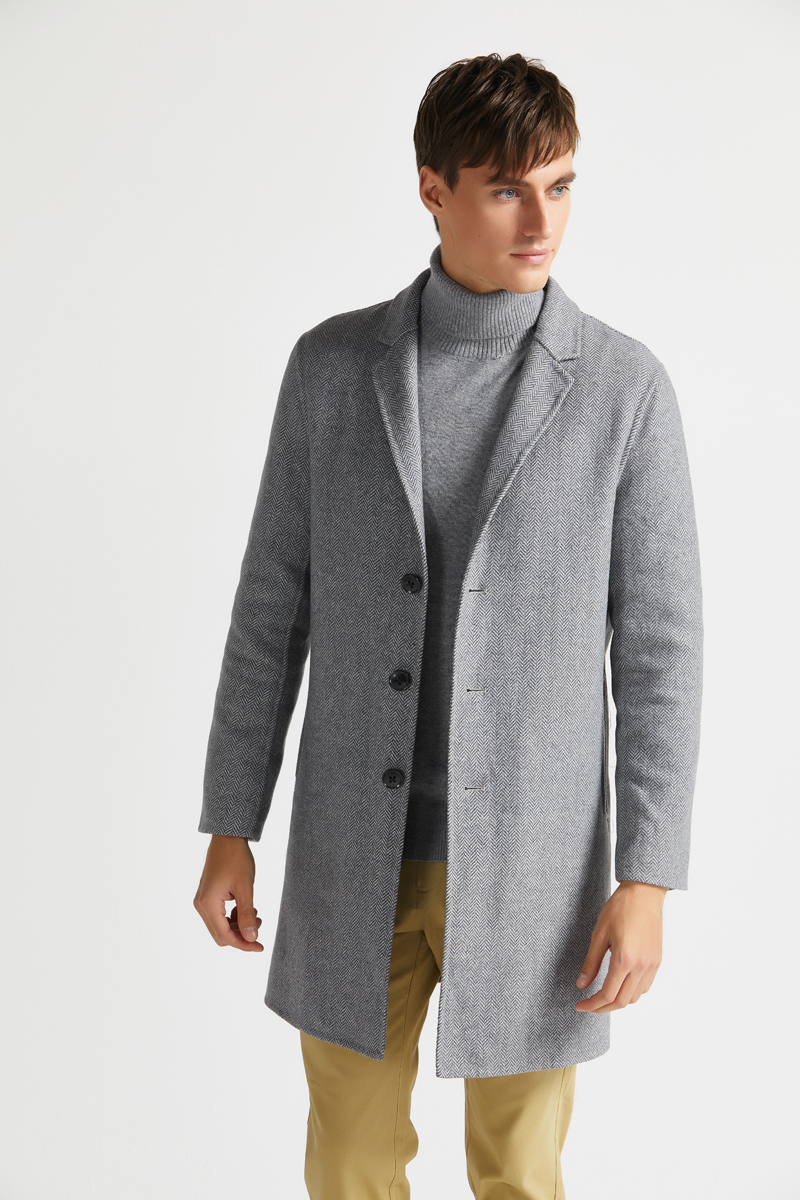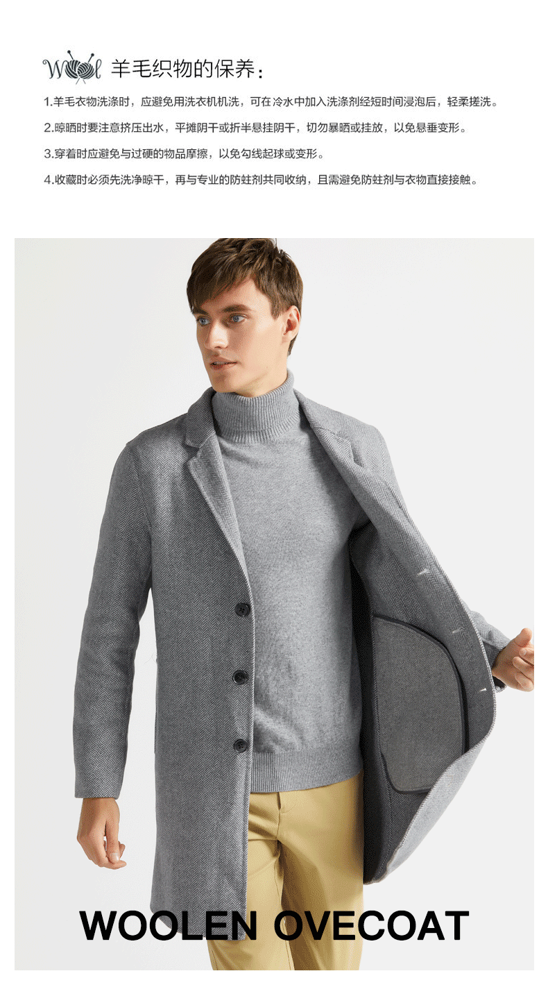 采用70%澳大利亚进口的超细美利奴羊毛+30%锦纶混纺而成,布面呈现人字纹理,提升整体档次,手感柔软亲肤,具有良好的触感,由于有锦纶的混入,同时兼顾挺括有型的呢料特质,可以展现大衣的版型和曲线。