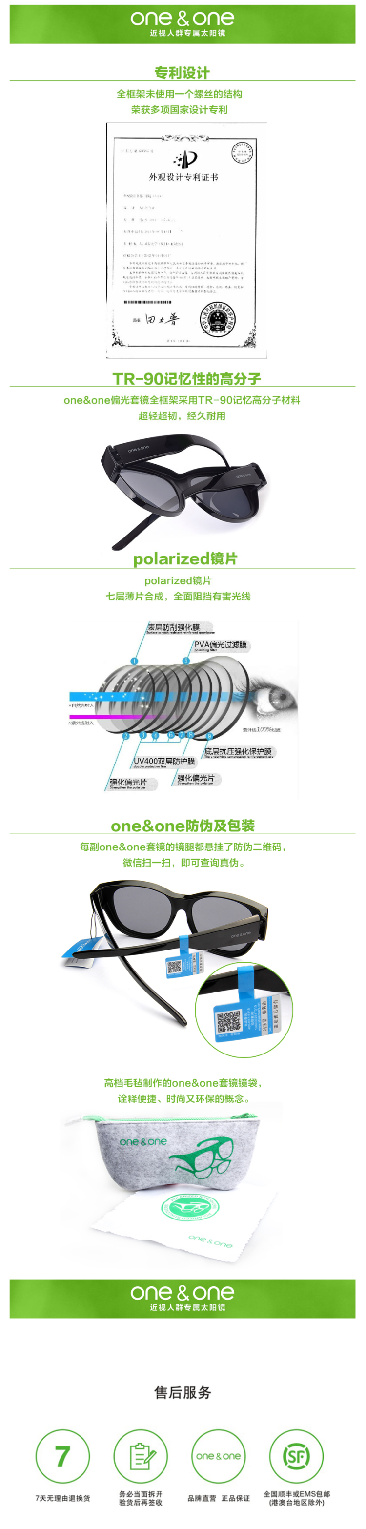 这款One&One 女偏光太阳镜是套镜,是专为近视患者设计的,可以直接套在近视的光学镜架上,对于近视的朋友来说非常友好。如果是隐形眼镜佩戴者或正常视力都可以直接佩戴,适合各类人群。