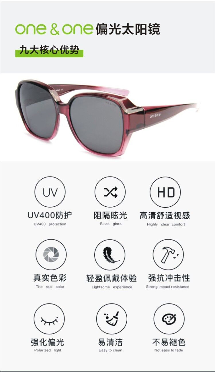 这款oneone 女偏光太阳镜是套镜,近视眼镜佩戴者可以直接套在近视的光学镜架上,对于近视的朋友来说非常友好。如果是隐形眼镜佩戴者或正常视力都可以直接佩戴,适合各类人群。