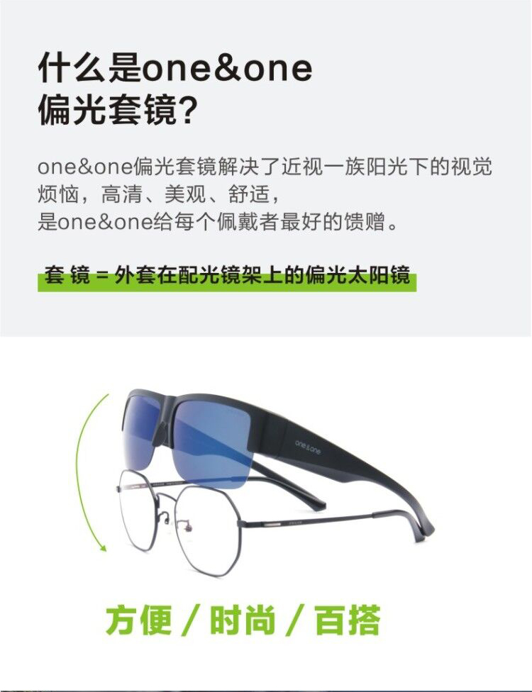 one&one的偏光套镜让近视人群可以轻松享受阳光视觉,解决近视人群的视觉烦恼。在线下占据近视太阳镜绝大部分的市场,是近视人群不可或缺的功能产品。