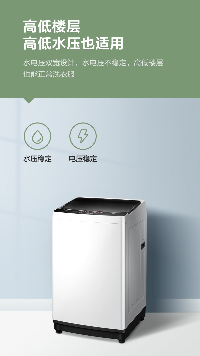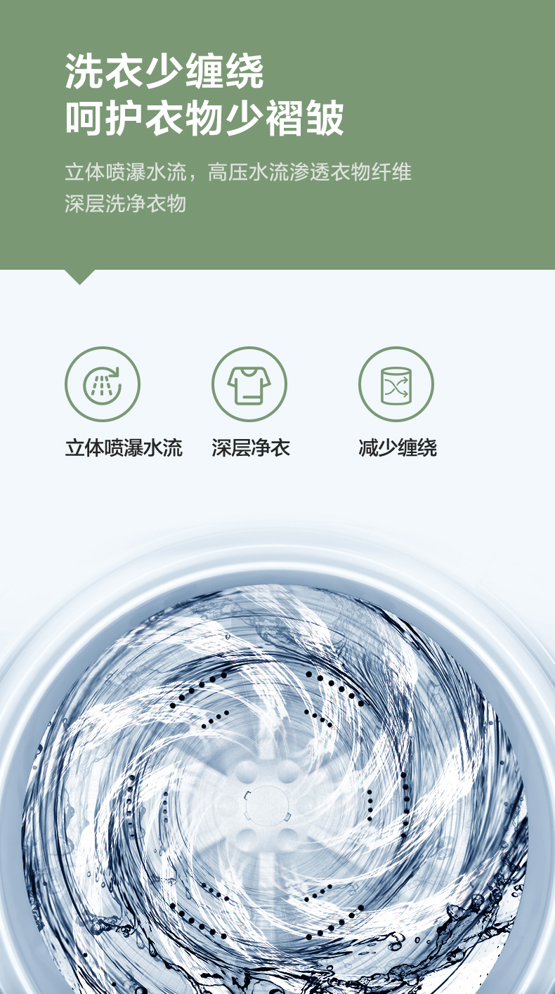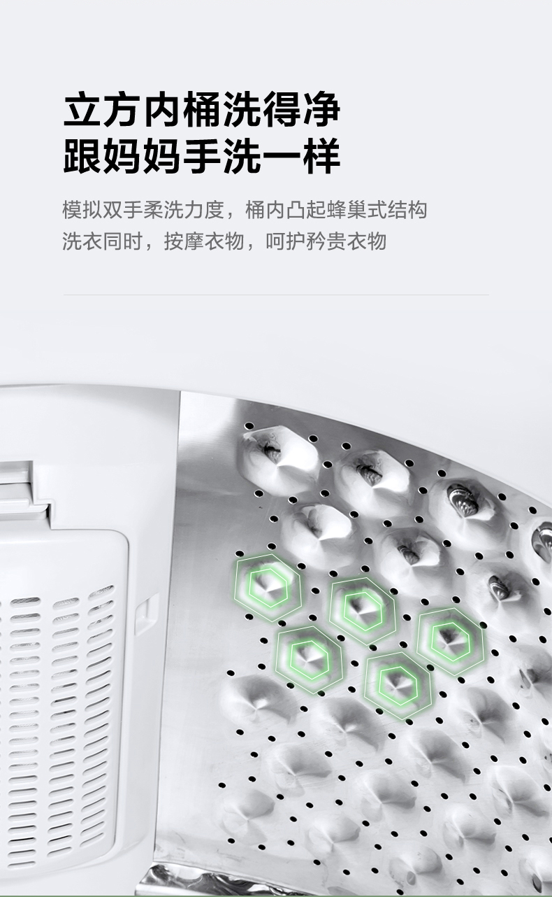 立体瀑布式水流,能够高效渗透衣物内部纤维,深层洗净衣物,并且能有效防止衣物缠绕,呵护衣物少皱褶,桶内凸起式蜂巢结构,模拟双手的揉洗力度,呵护衣物,水电压双宽设计,水电压不稳定时也可以正常使用,8公斤大容量,轻松洗大件。