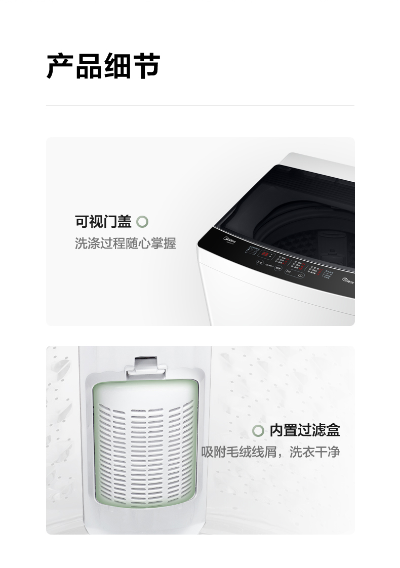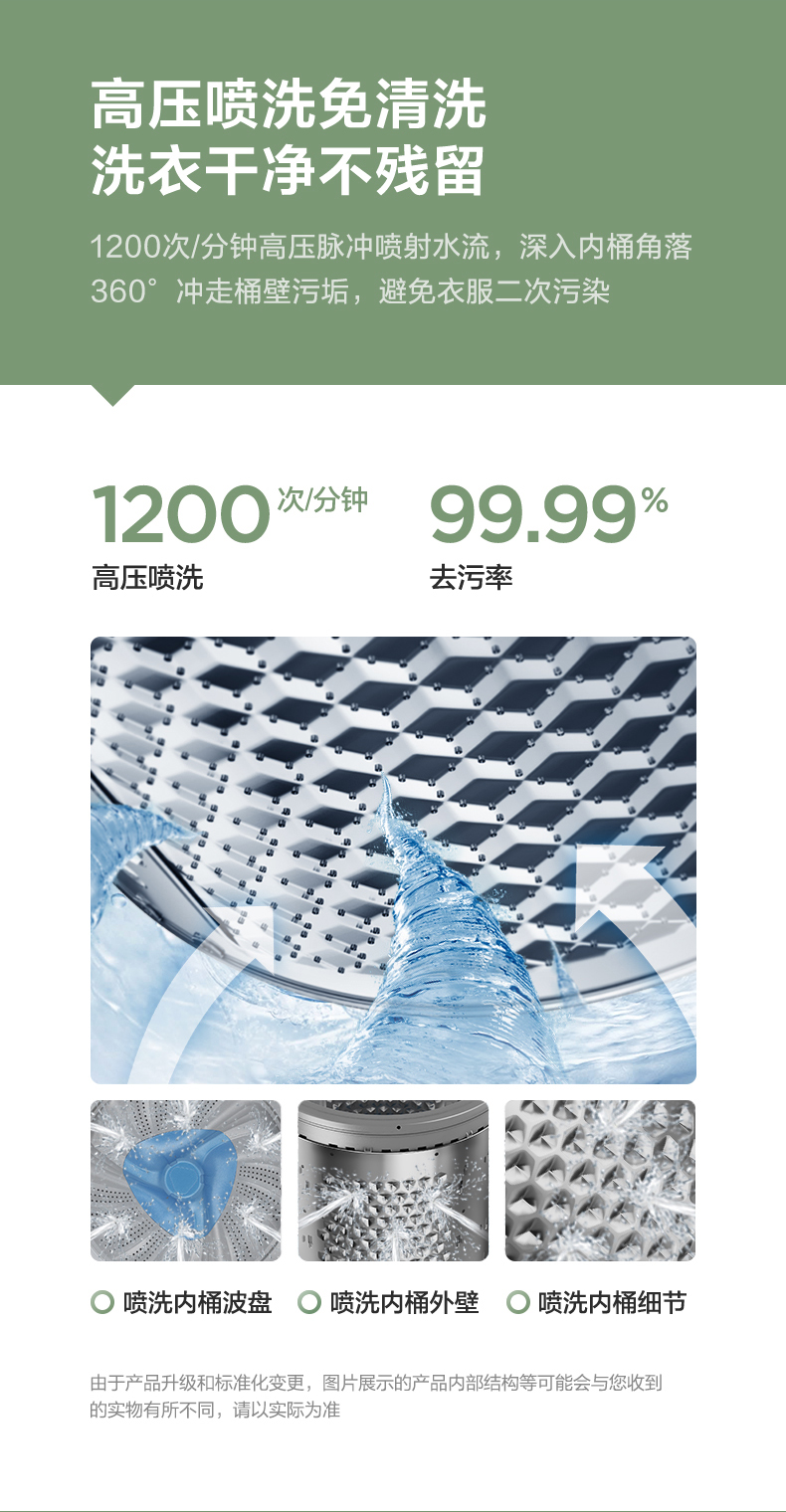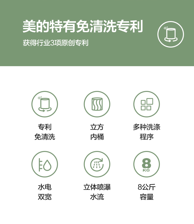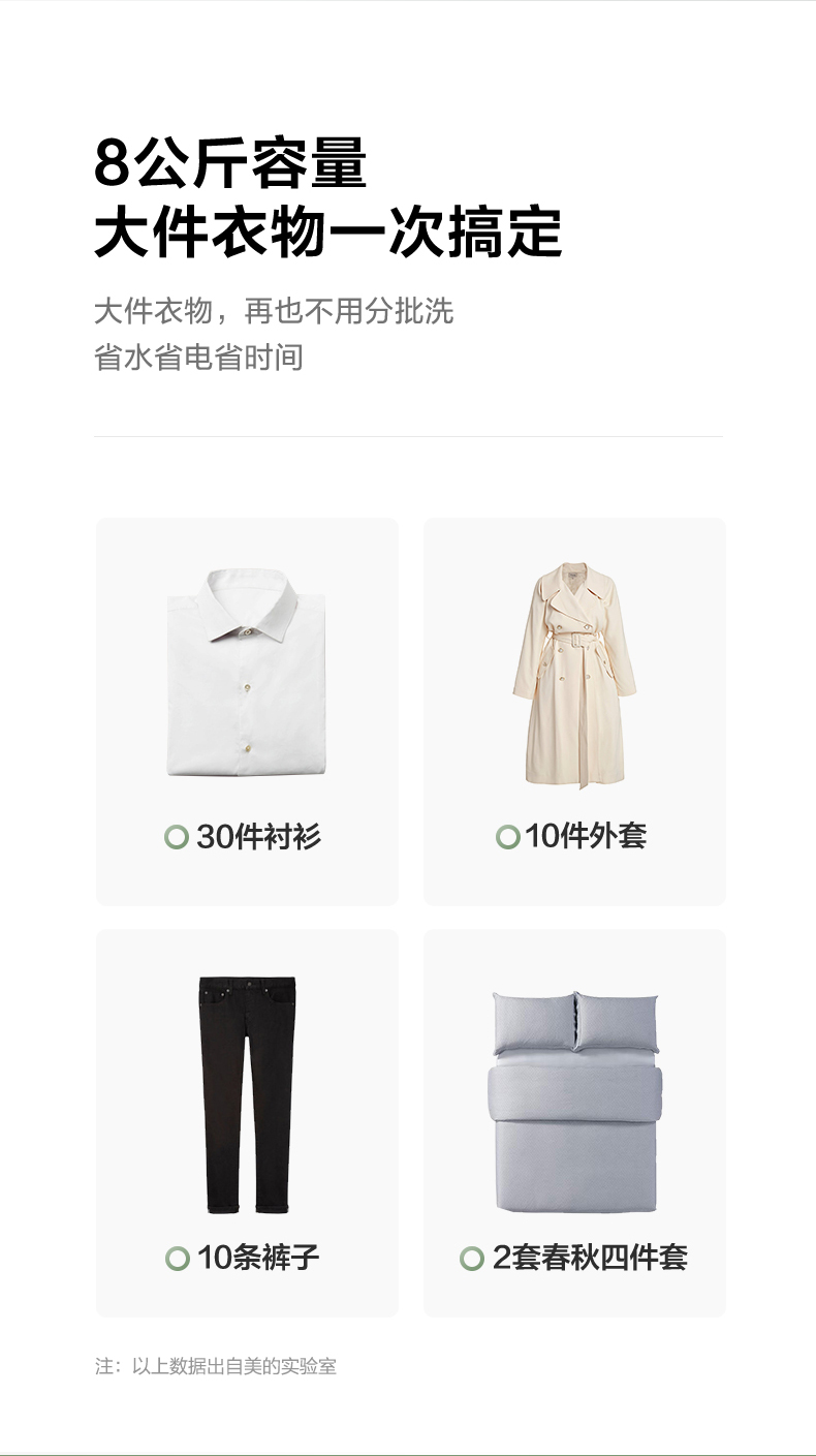 立体瀑布式水流,能够高效渗透衣物内部纤维,深层洗净衣物,并且能有效防止衣物缠绕,呵护衣物少皱褶,桶内凸起式蜂巢结构,模拟双手的揉洗力度,呵护衣物,水电压双宽设计,水电压不稳定时也可以正常使用,8公斤大容量,轻松洗大件。