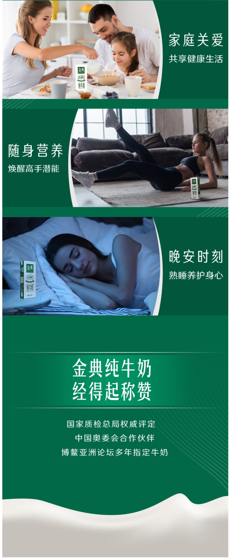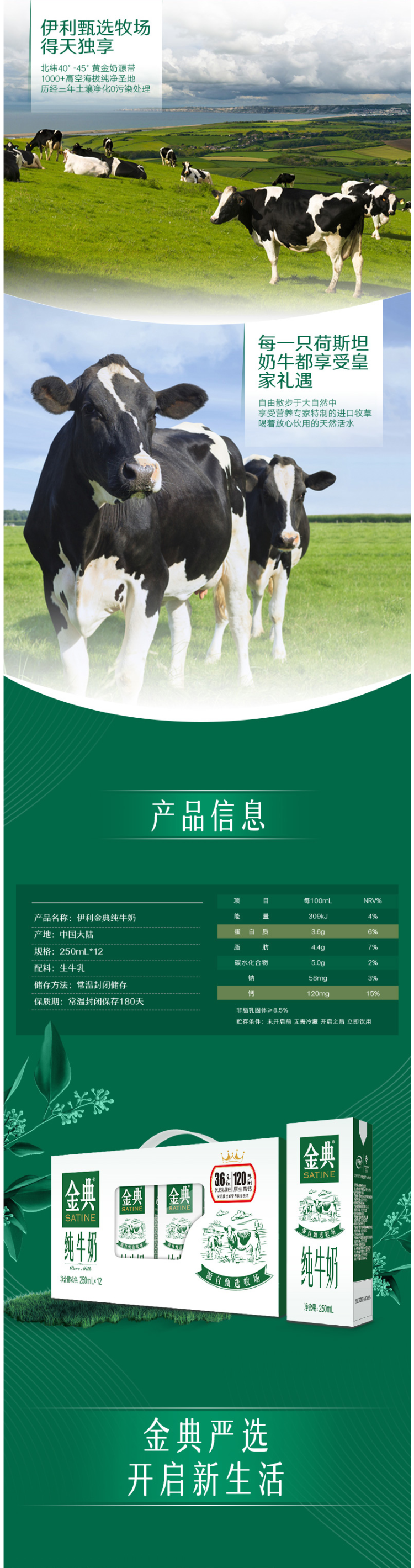 这款金典牛奶源自伊利甄选牧场,奶源无污染,确保绿色健康,优质乳蛋白高于3.3g,营养丰富,唇齿留香。