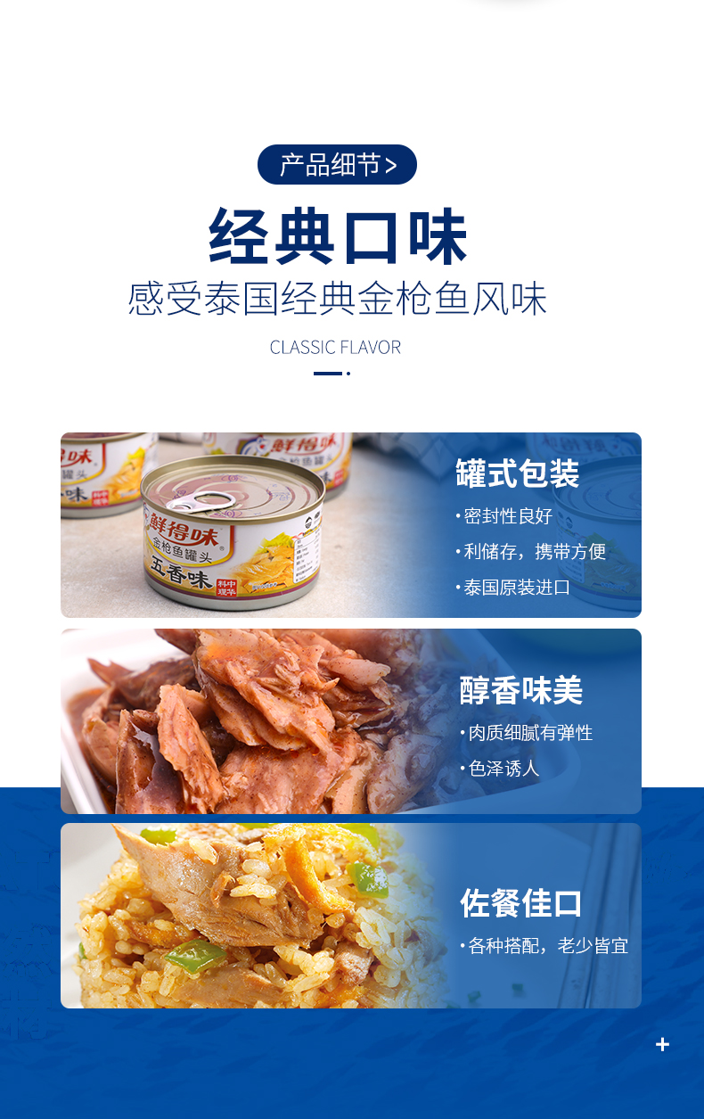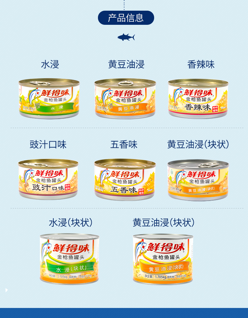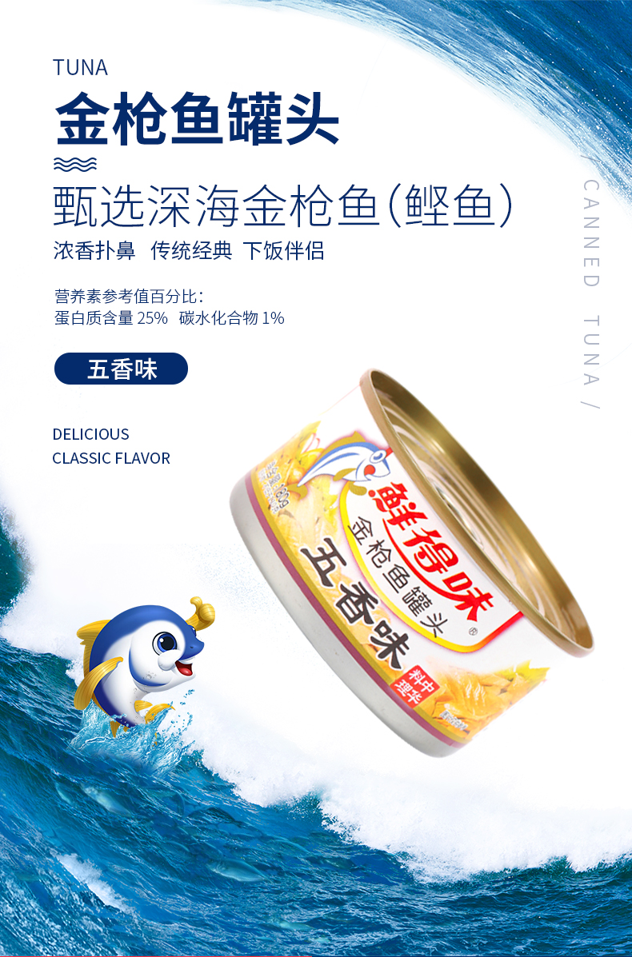 鲜得味 水浸金枪鱼罐头,生产日期是2019年5月。选用从菲律宾深海捕捞的天然野生金枪鱼(鲣鱼)的鱼排部位,脂肪含量低仅8.4g,鱼肉色泽鲜黄,肉质细嫩有嚼劲,完整的大块金枪鱼肉,非碎肉。