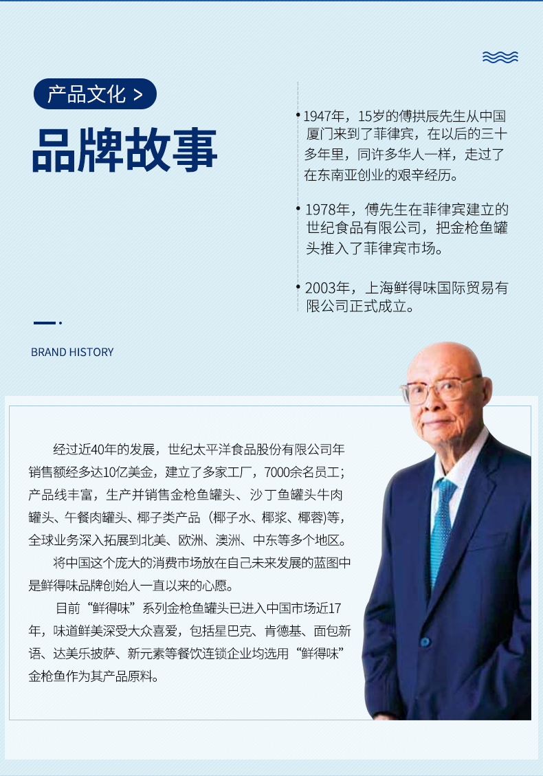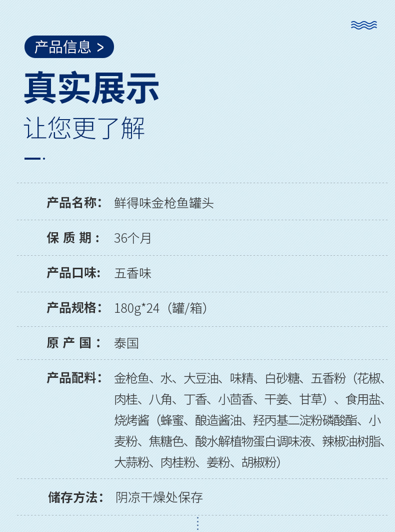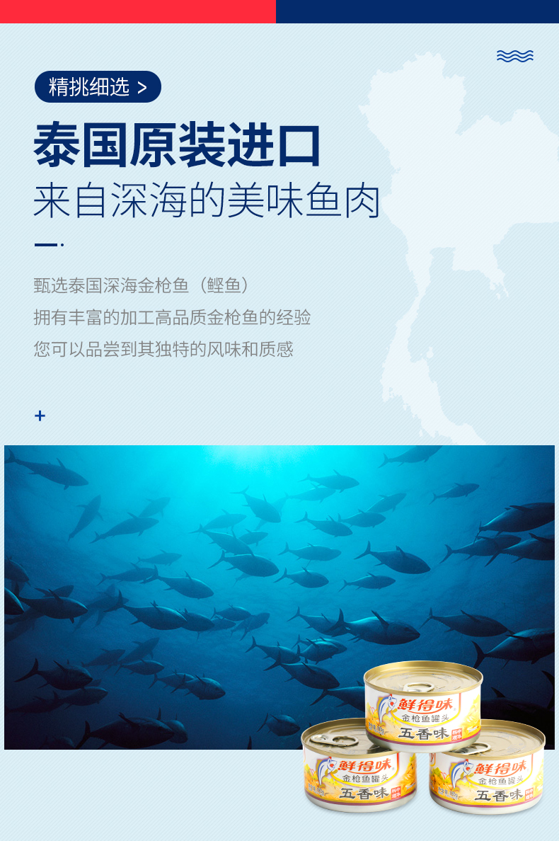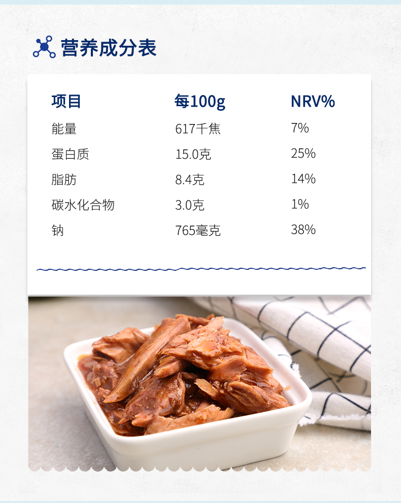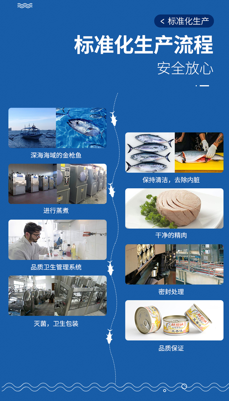 采用高温杀菌模式,保留了鱼肉本身的美味和营养,将鲜度锁于罐内,无需防腐剂,也能达到长久保鲜的目的。高温真空罐装,用矿泉水浸,可放心食用。