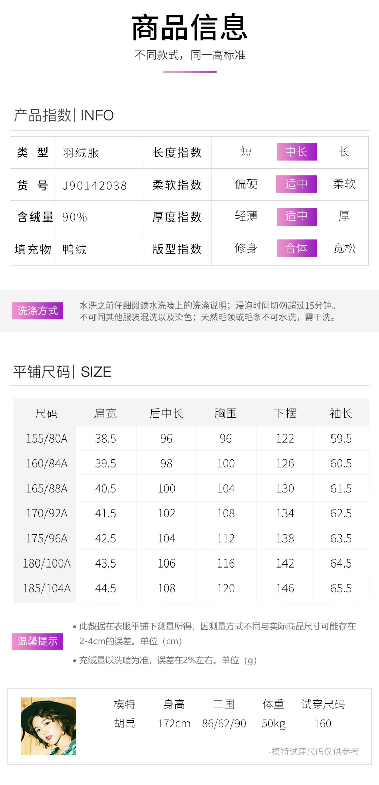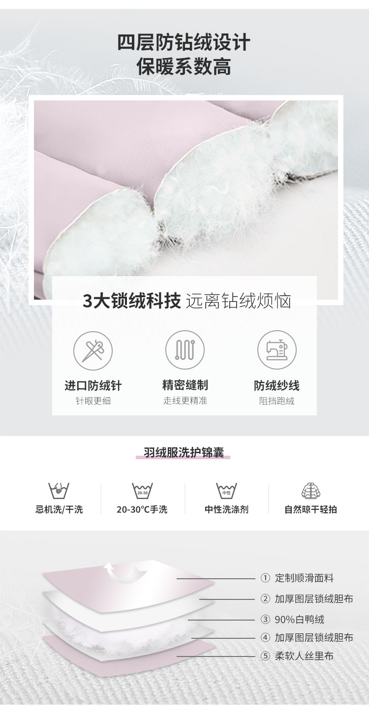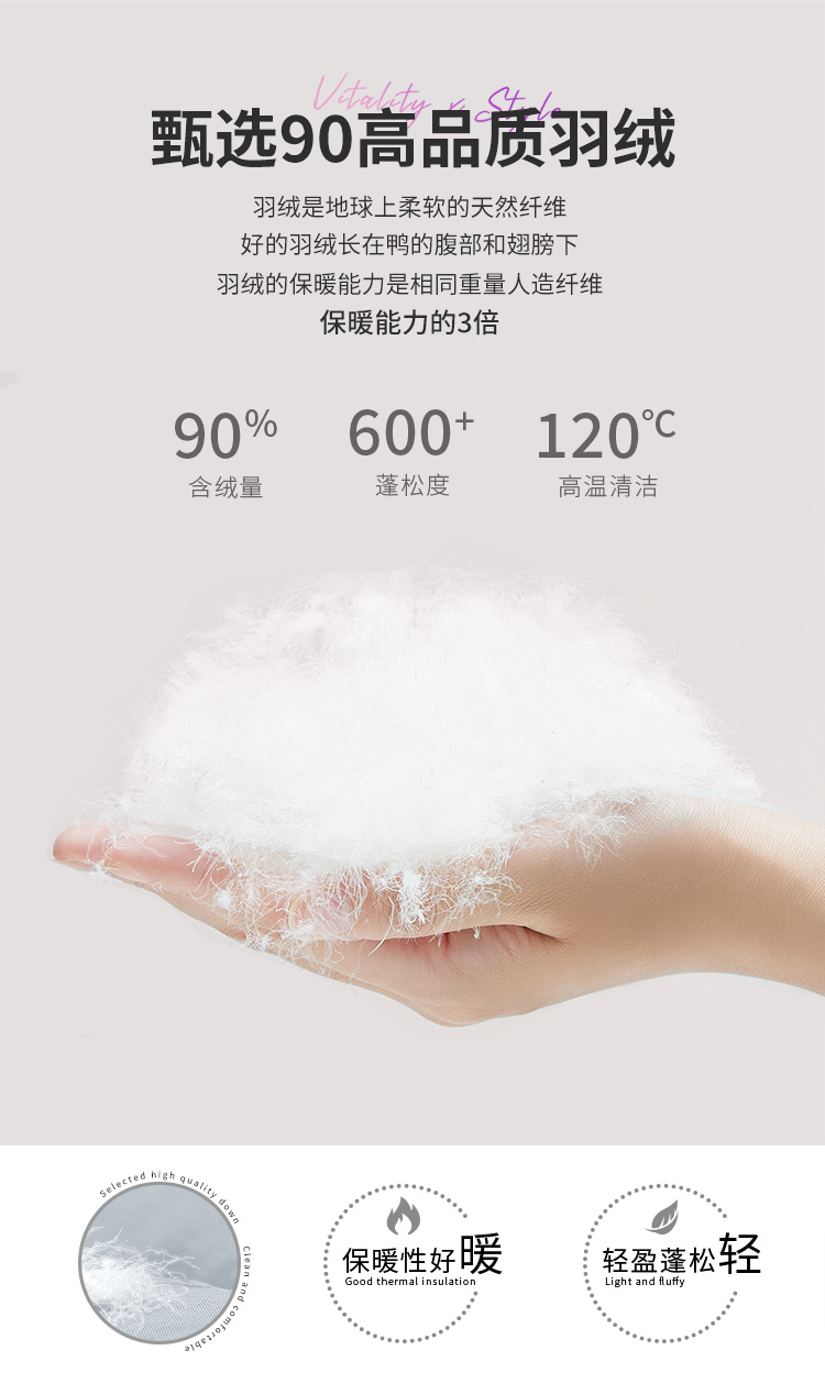 这款羽绒服采用20D尼龙面料,内里填充高品质90%鸭绒,蓬松度达到了600+,且经过120℃的高温蒸汽烘干消毒,洁净度高。表面面料经过防泼水工艺处理,不惧小雨小雪,出门满满安全感。