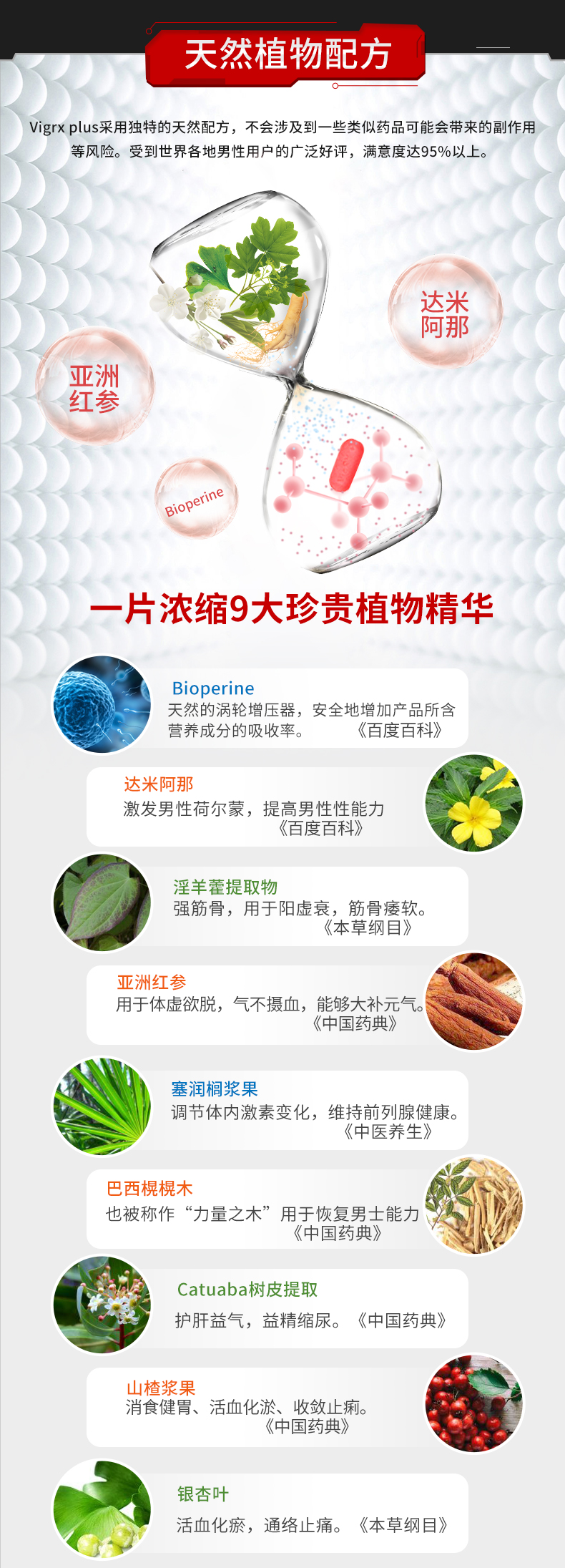 其中淫羊藿萃取液增加睾丸激素的产生,达米阿那增加阴茎血流量和神经冲动,锯棕榈活化睾酮通路,亚洲红参大补元气,固脱生津、定神,黑胡椒帮助人体吸收营养素和矿物质,锌元素可以改善精子数量、活力质量和活跃度。服用方法:每天2次,每次1片。
