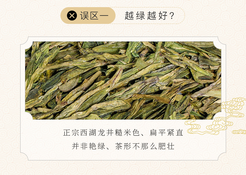 从等级高低来分,是糙米色(米黄色)-黄绿色-绿黄色-绿色-深绿色。西湖龙井并非越绿越好,一般谷雨茶基本上颜色都是绿多黄少的绿黄色。