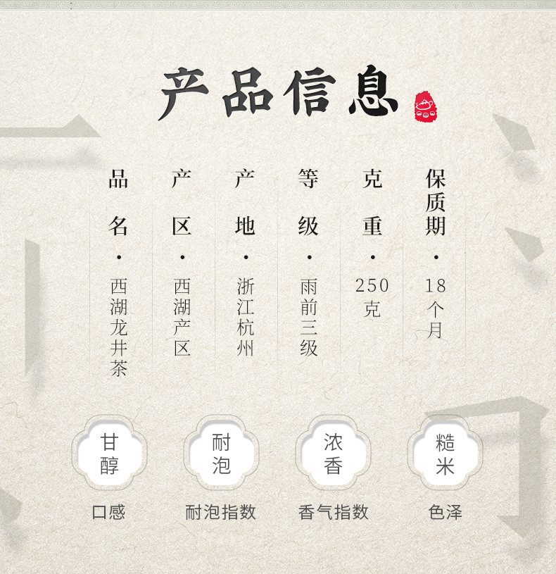 梅府茗家为杭州品道茶叶有限公司旗下核心品牌,公司在梅家坞、狮峰山设有原生态茶园、无公害基地。此款为雨前三级,干茶扁平光滑,色泽为绿黄色,略有花杂。茶叶滋味较为醇和,延长浸泡时间可以更浓一些,减少投茶数量可以更淡一些,随个人口感。