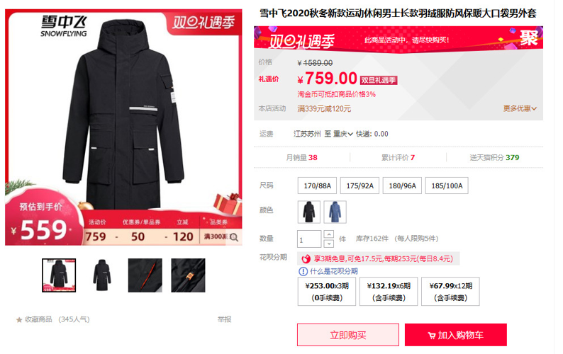 现售价759元,下单立减120元,再叠50元优惠券,满300-30品类券,实付到手价559元包邮