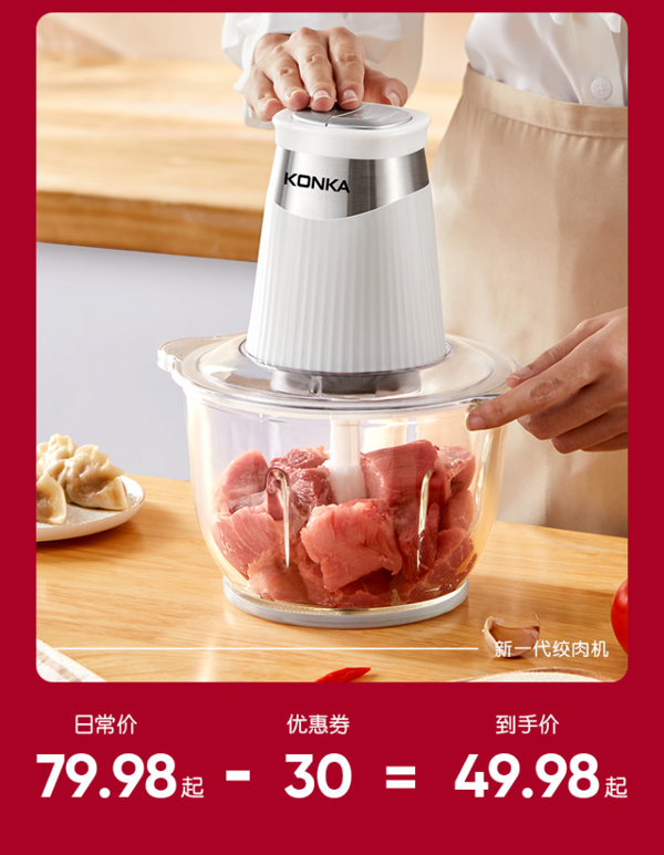 天猫康佳腾耀专卖店89.98元,可领40元优惠券,实付49.98元到手,2斤玻璃碗款此价,6秒碎食,四叶刀头,加厚玻璃碗,智能一键操作!不如买台康佳绞肉机,靠别传统剁肉方式,远离细菌,谁用谁喜欢!【七天无理由退款】