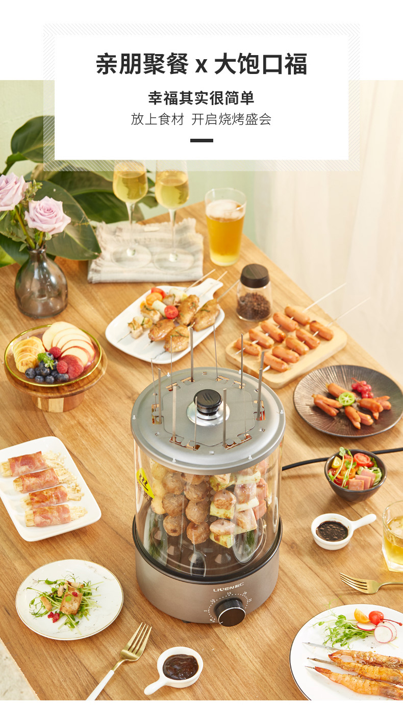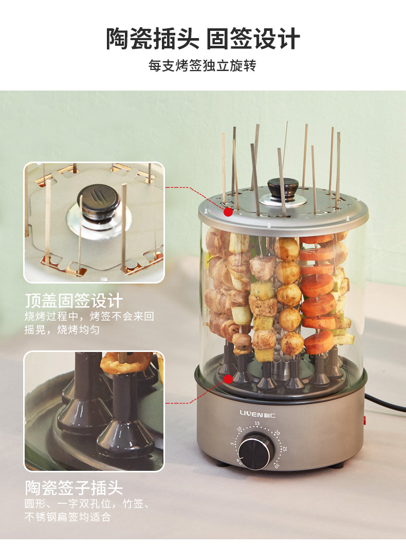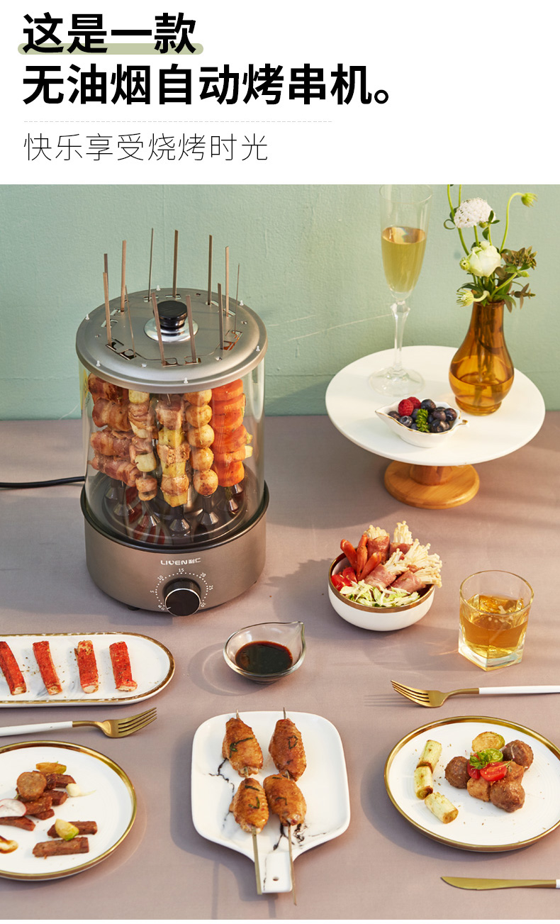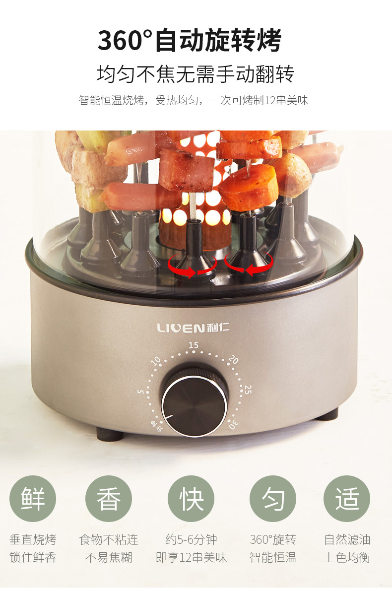 这款利仁烤串机采用360度自动旋转,烤肉均匀,不易焦糊,食用也无毒无害,底部接油经过特别设计,使油脂不与发热体直接接触,不产生油烟,中部发热管1100W大功率,烤肉仅约6分钟即可烤熟,无需长时间的等待,而且侧边可视设计,可以随时掌握火候。