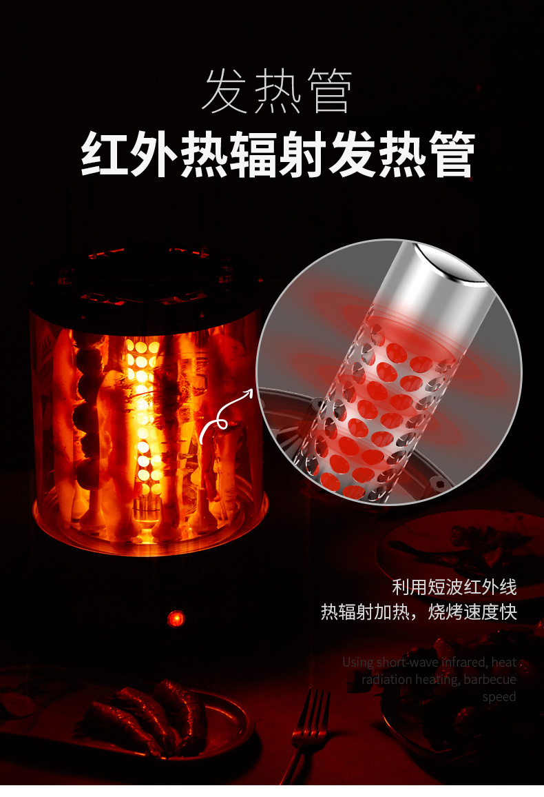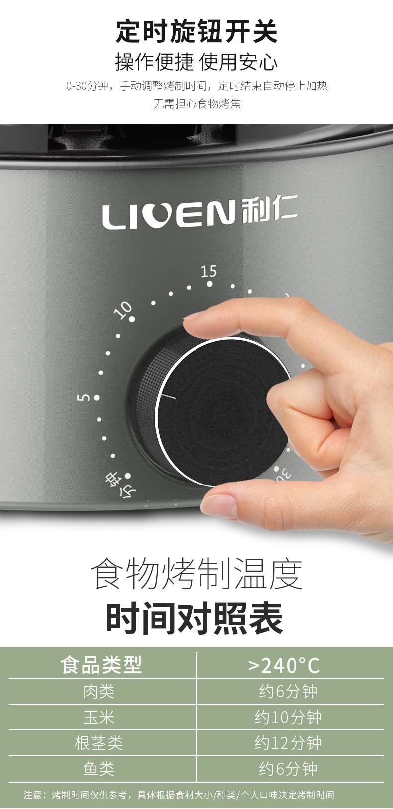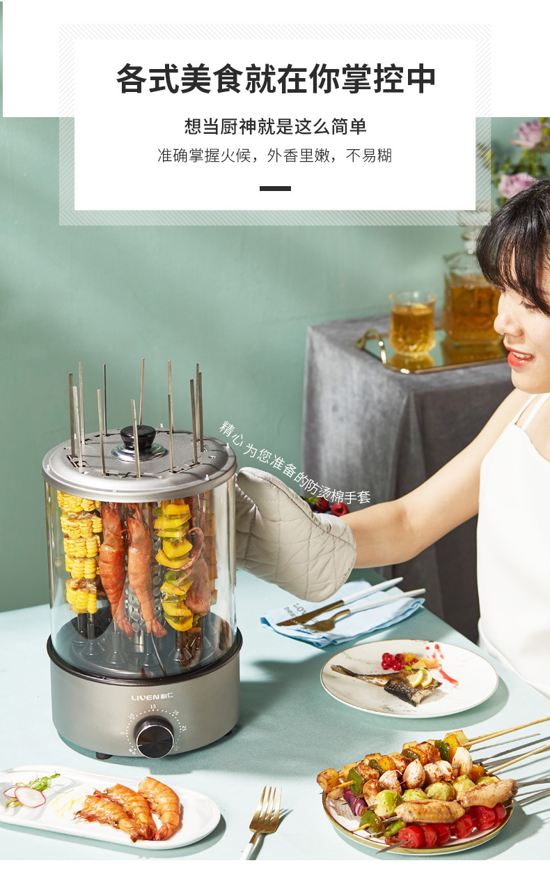 这款利仁烤串机采用360度自动旋转,烤肉均匀,不易焦糊,食用也无毒无害,底部接油经过特别设计,使油脂不与发热体直接接触,不产生油烟,中部发热管1100W大功率,烤肉仅约6分钟即可烤熟,无需长时间的等待,而且侧边可视设计,可以随时掌握火候。