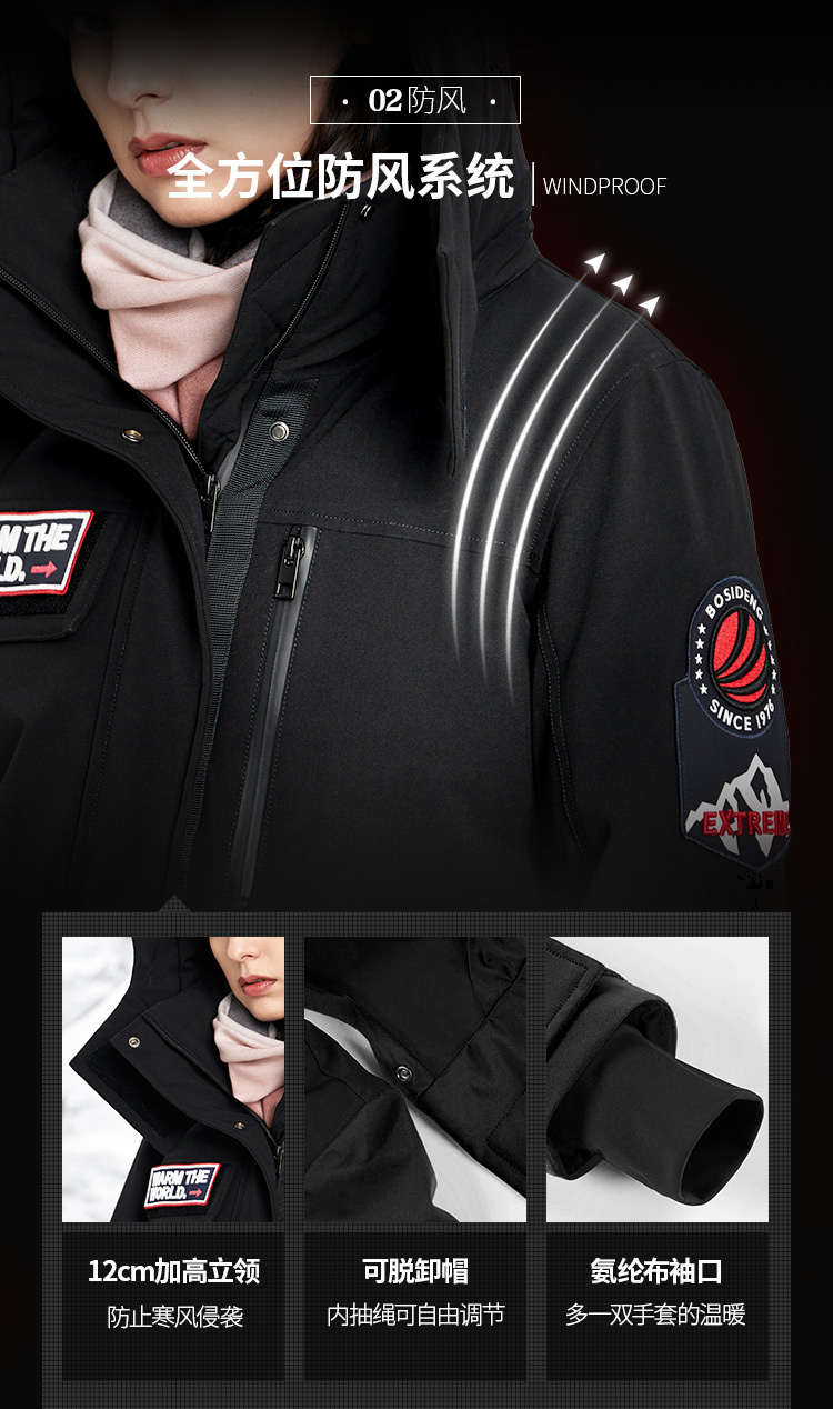 这款是波司登极寒系列,所用羽绒全部甄选鹅胸腹间大绒朵羽毛,蓬松度高,保暖效果优异。加高12cm衣领,全方位防风,并经过高机能拒水工艺处理,防水指数达到7200+,透湿指数达到7800+,可有效防止冷风侵入,充分保证羽绒的蓬松性、干燥性,进一步提升保暖效果。始终保持内里皮肤干燥,穿着舒适。高密面料搭配德国防绒针,再配合超细纤维材质内胆,可有效防止钻绒。