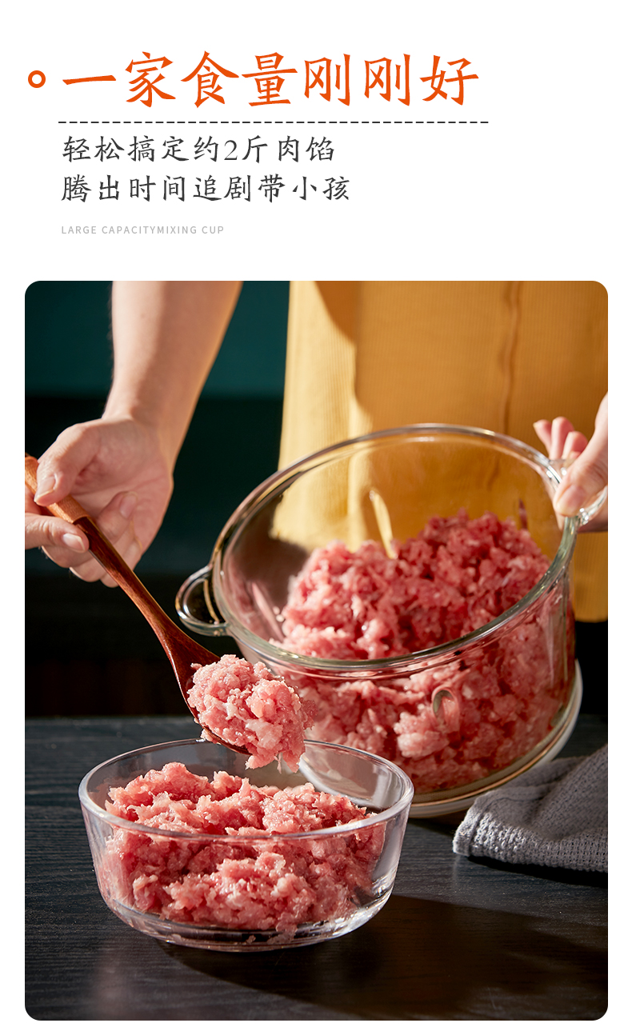 大功率,搭配四叶不锈钢刀头,6秒碎食,可绞肉、碎菜、做辅食等,加厚玻璃碗,快慢2档,告别传统剁肉方式,省心省力,远离细菌,家庭实用必备~