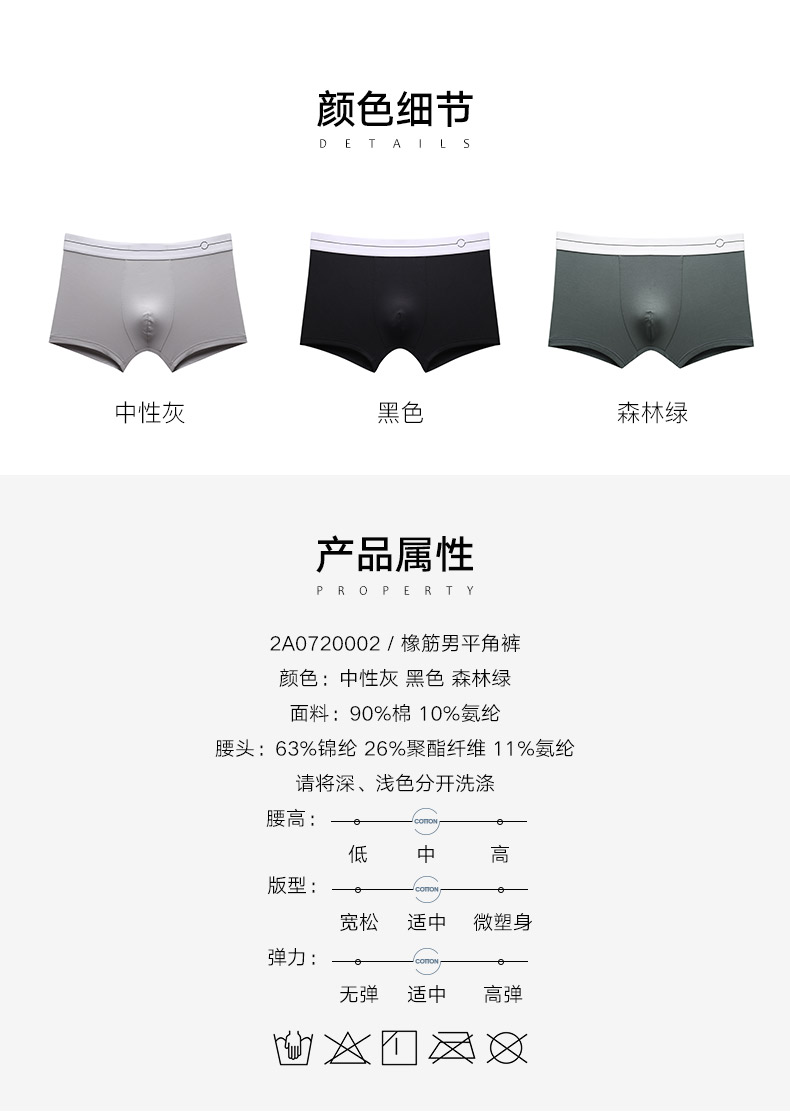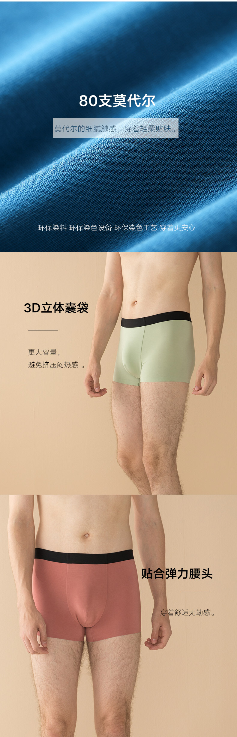 和纯棉面料相比,莫代尔手感更柔,吸湿更快更干爽,连续穿几天也没有棉质内裤松懈。莫代尔面料要混入氨纶弹力纤维,拥有弹力贴身的穿着感,又不会像尼龙或聚酯纤维有明显的紧绷感。