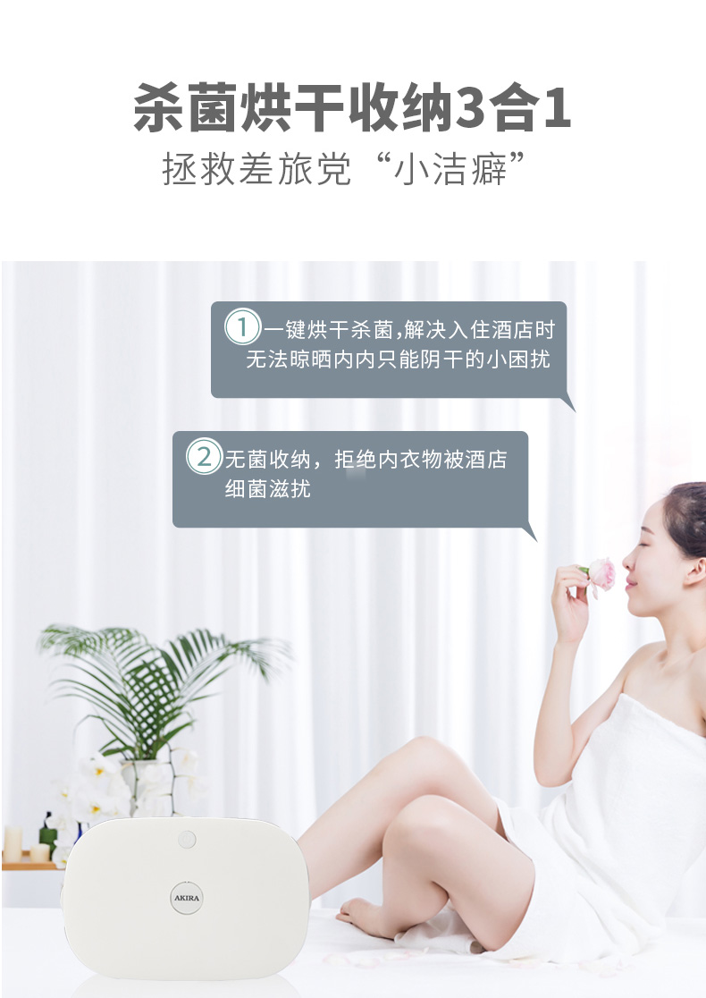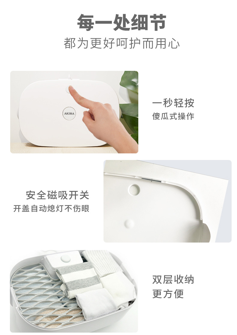 细节上:安全磁吸开关,开盖自动熄灯不伤眼。4.5L双层收纳设计,女性内衣可放3-5套,男性内衣+袜子8-10套,外出旅行携带方便。