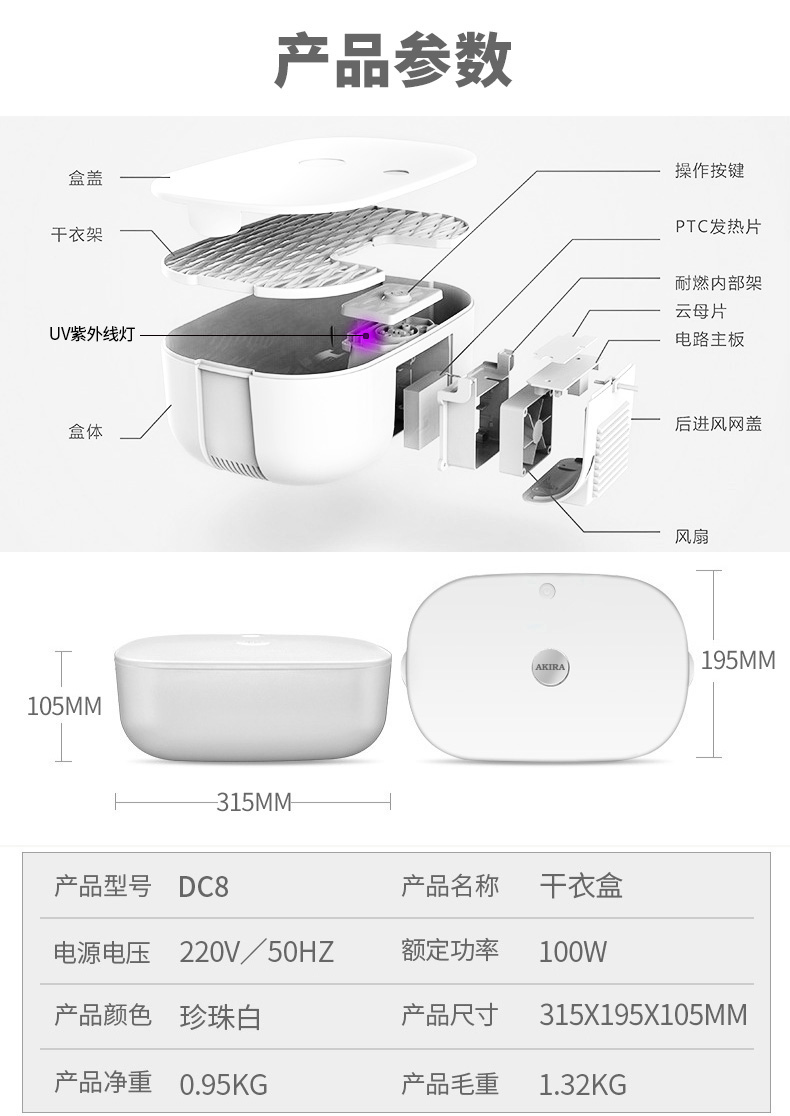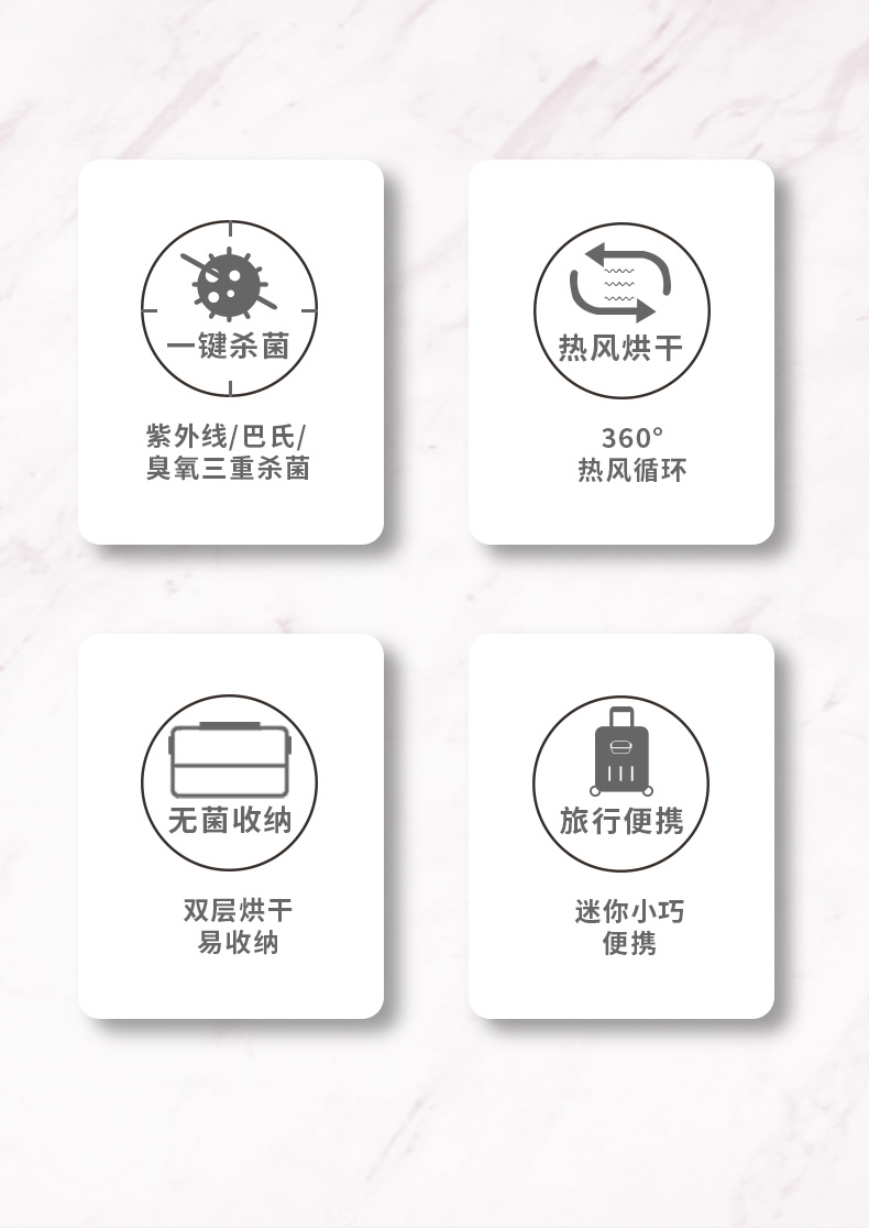 蓝灯:3H热风烘干/巴氏杀菌 10分钟紫外线杀菌;