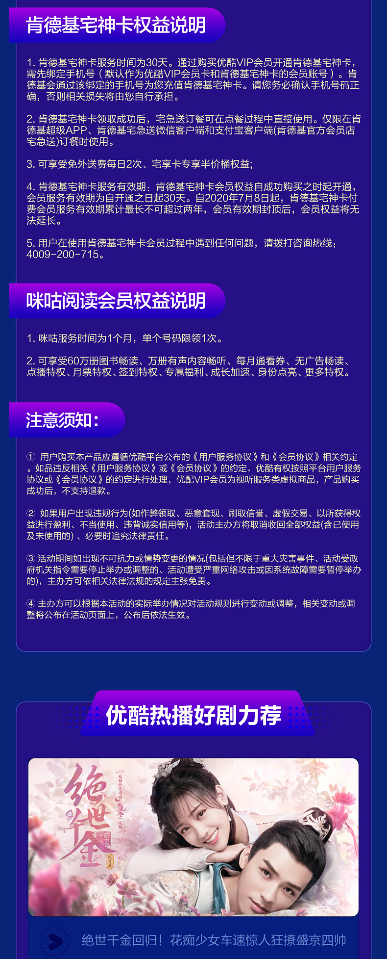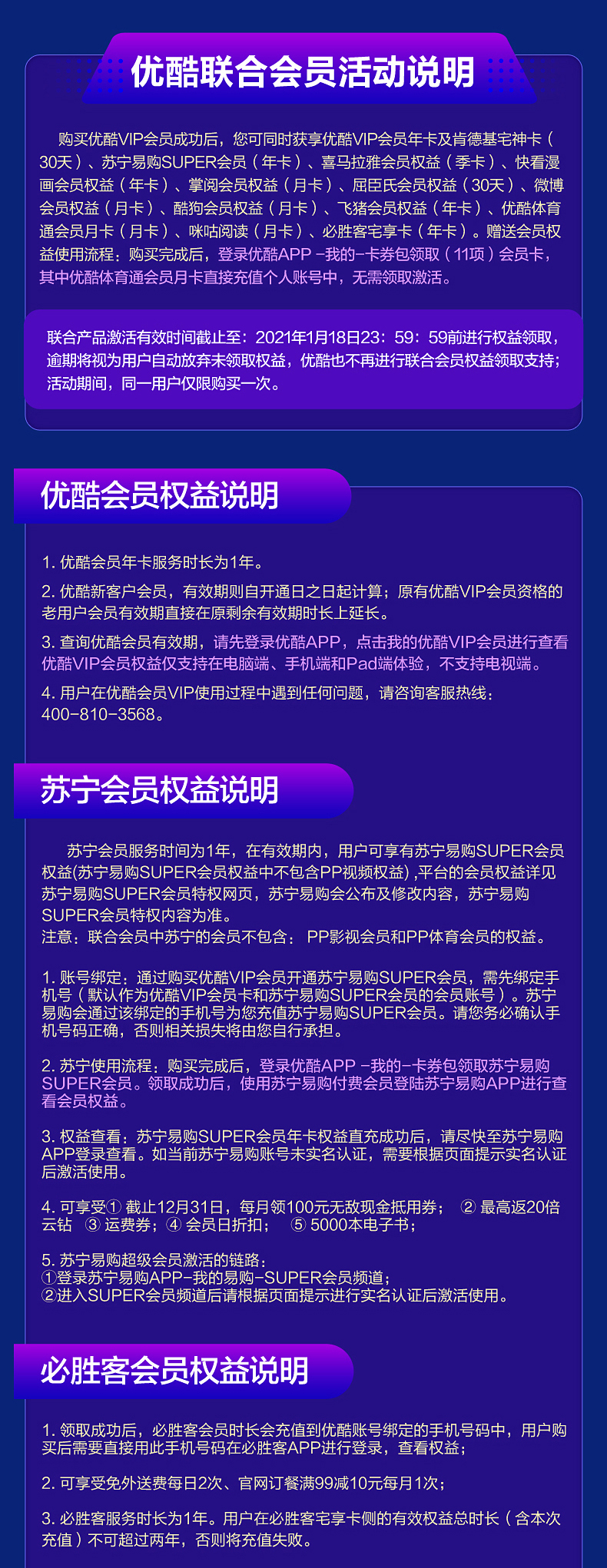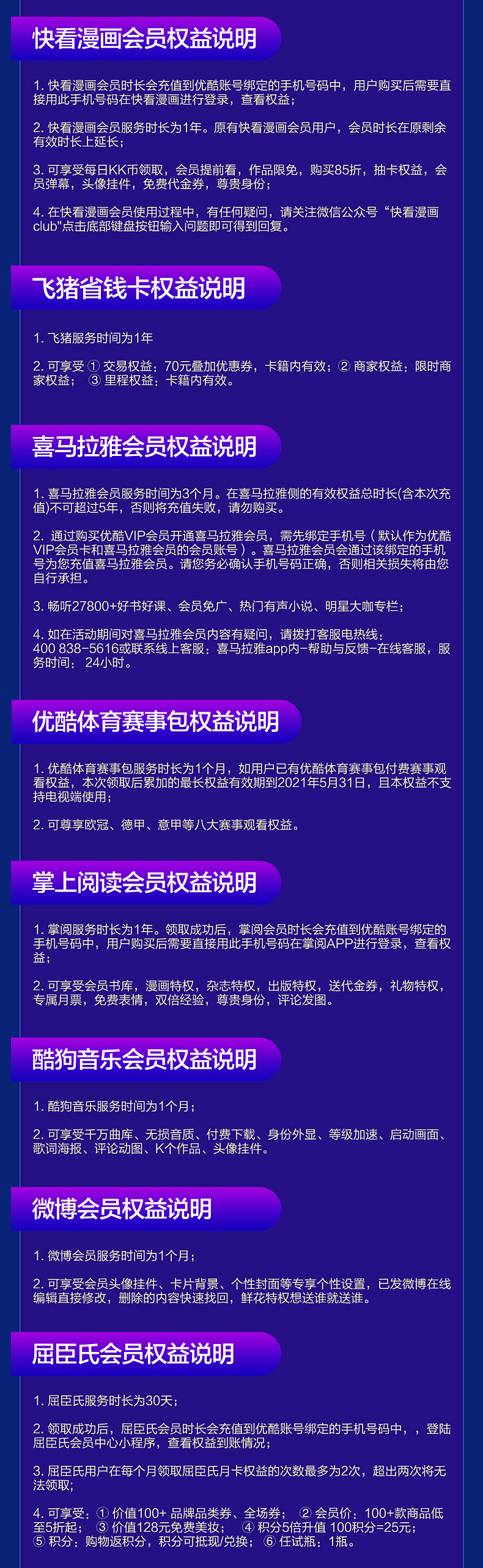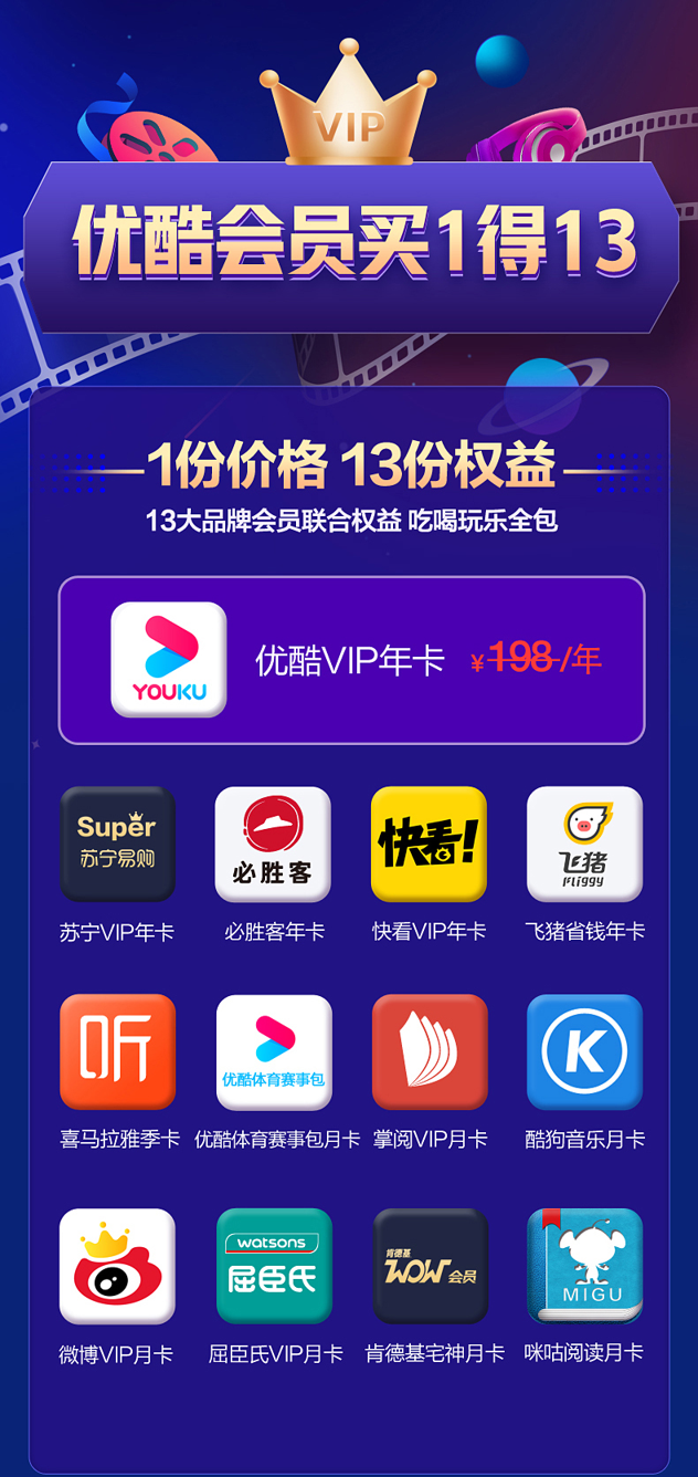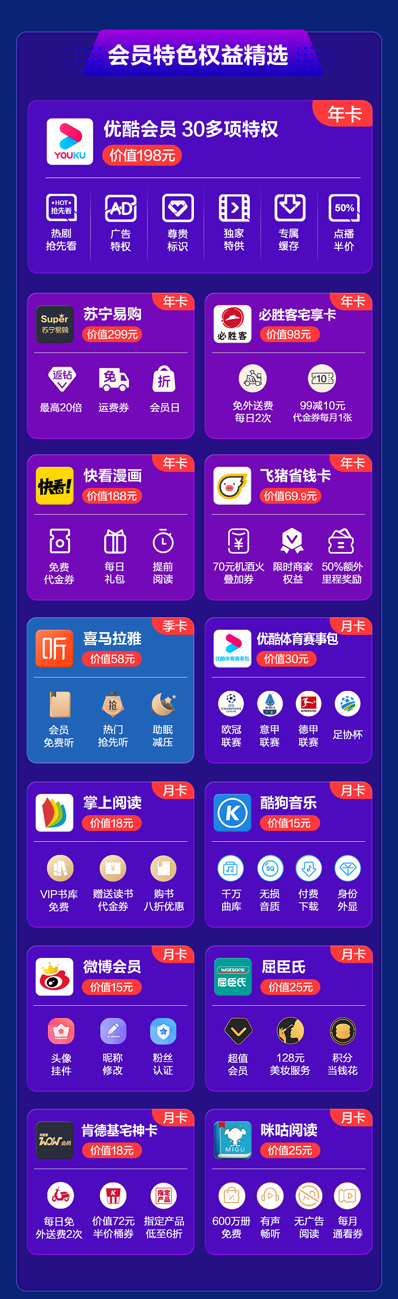 年卡:优酷、苏宁会员、必胜客、快看、飞猪季卡:喜马拉雅月卡:优酷体育赛事、掌阅、酷狗音乐、微博、屈臣氏、肯德基、咪咕阅读