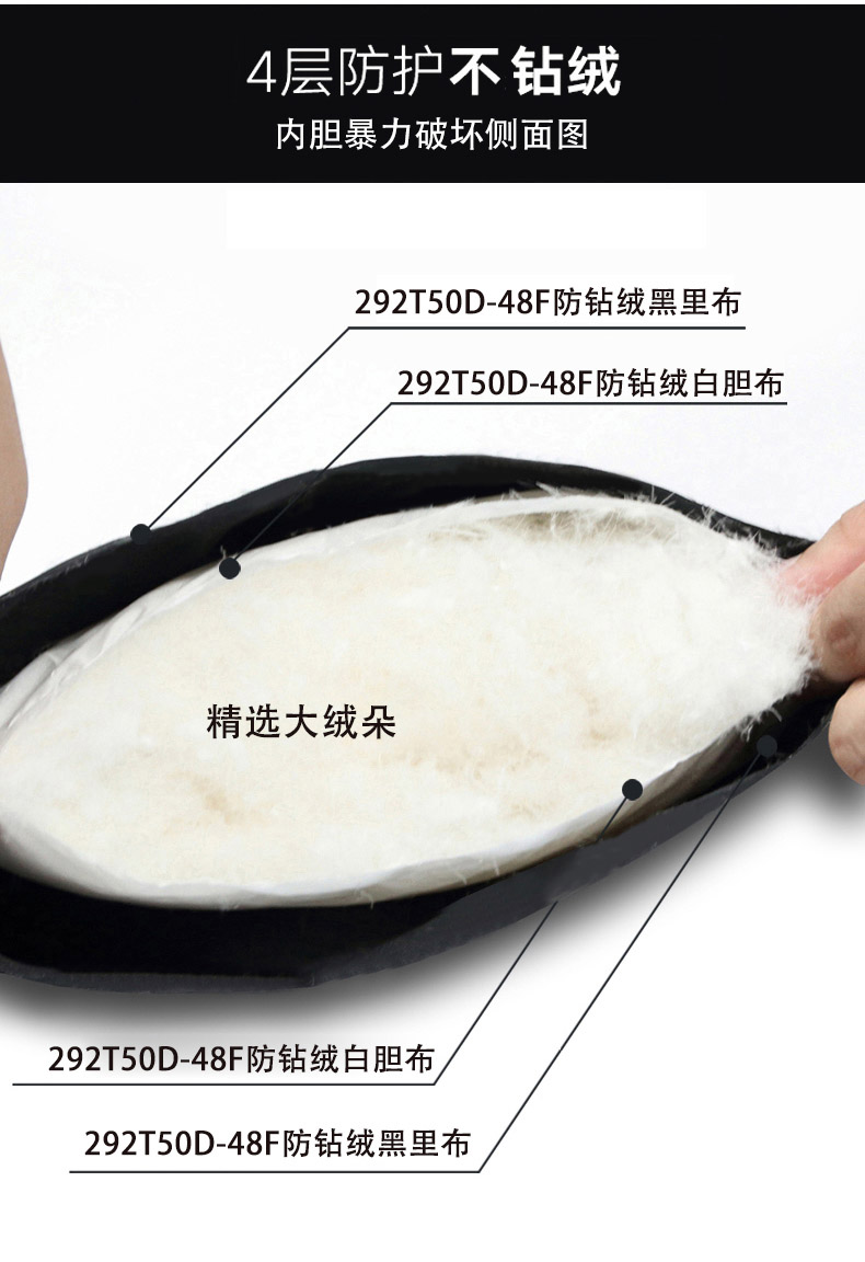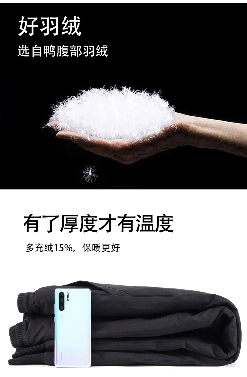 内里填充优质80%白鸭绒,多层隔舱充绒,告别钻绒的烦恼,细节处也做了改良,后袋改为了隐藏式拉链口袋设计,置物方便,秋冬季可直接单穿,保暖不臃肿。