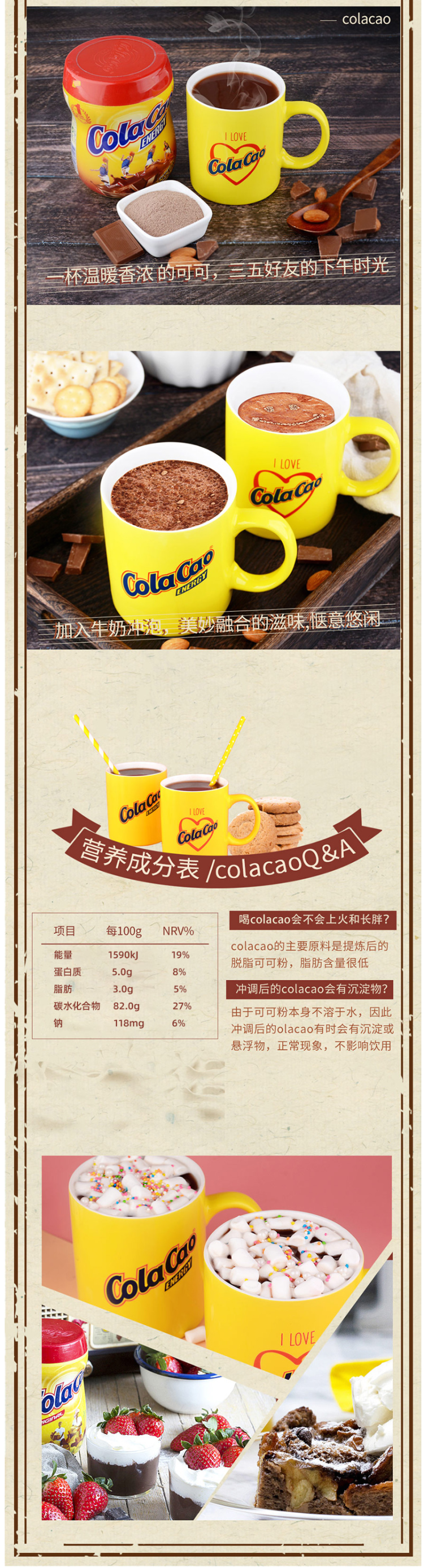 这款ColaCao 经典原味可可粉,西班牙原装进口,精选上好脱脂可可粉,经过一系列加工提炼,粉质细腻不易结块,伴随有浓浓的巧克力香,冲泡后质地细腻口感顺滑。