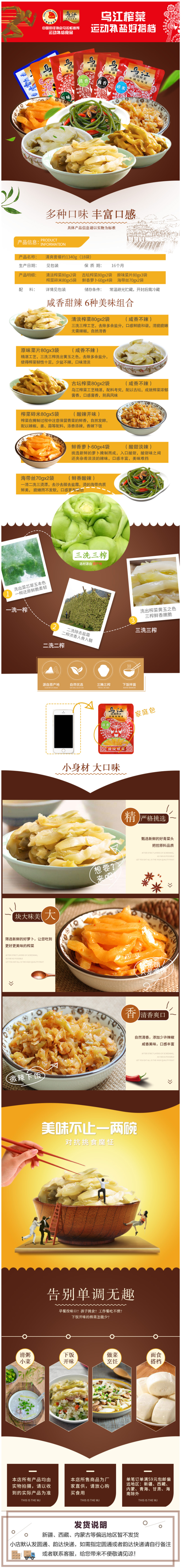 涪陵榨菜已有一百多年的历史,位居世界三大名腌莱之首,历来被列为素菜佳品其工艺独特,鲜香脆嫩,回味悠长。乌江榨菜是重庆市涪陵榨菜集团旗下众多榨菜品牌之一,运用三洗三榨工艺,去除榨菜多余盐份,口感更加香脆和谐。
