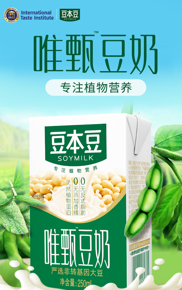 豆本豆是达利食品集团于2017年推出的天然不添加的豆奶品牌。严选来自“北纬43'~539” 东北黑土大豆产区的大豆,采用创新四大核心工艺加以制作成一杯醇正、香浓、不添加的营养好豆奶。