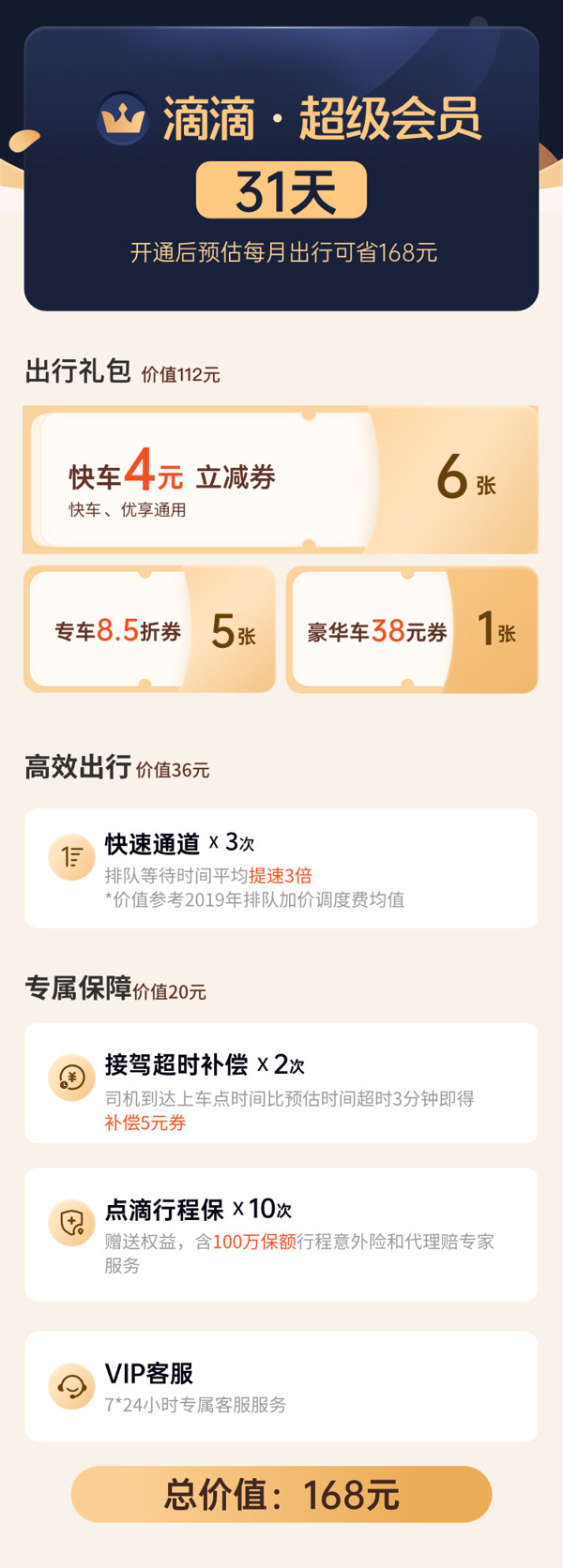 滴滴出行超级会员月卡,含6张4元快车立减券、5张专车8.5折券、1张豪华车38元券、3次快速通道、2次接驾超时补偿、10次点滴行程保,总价值168元。