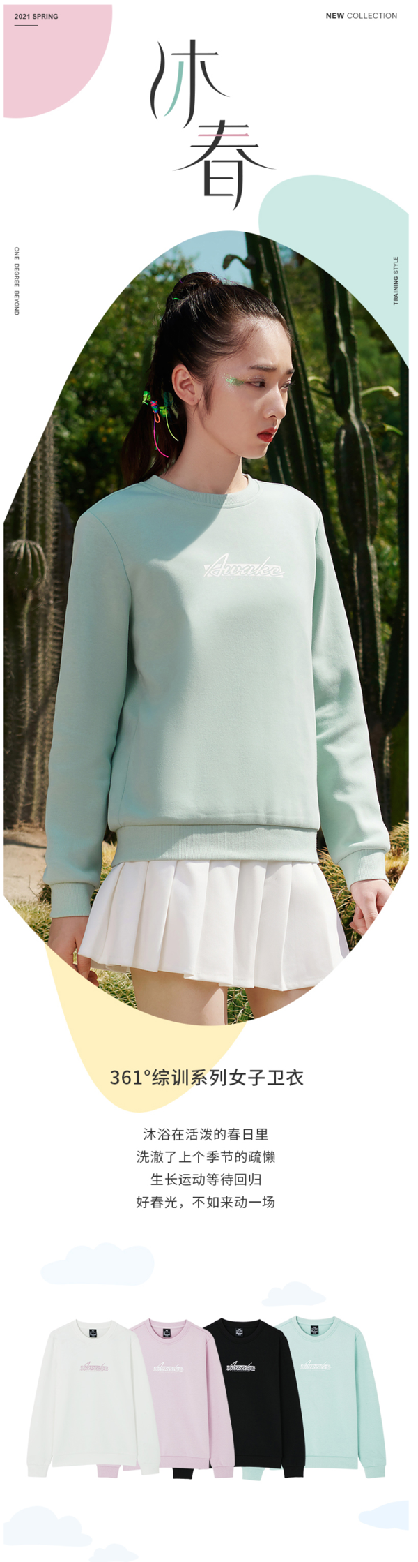 这款361度女运动卫衣,是2020年的秋冬新款,属于综训系列,采用棉涤面料,拥有接近纯棉的轻柔手感和舒适度,面料质地轻盈,透气舒适。前胸是手写体个性印花,线条柔美,罗纹领口、袖口和下摆,适合春秋天穿。