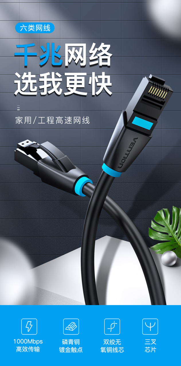 这款威迅六类千兆网线,1000Mbps高效传输速度,磷青铜镀金触点、双脚无氧铜线芯、三叉芯片,传输稳定抗干扰,与网线口咬合紧不易松脱。